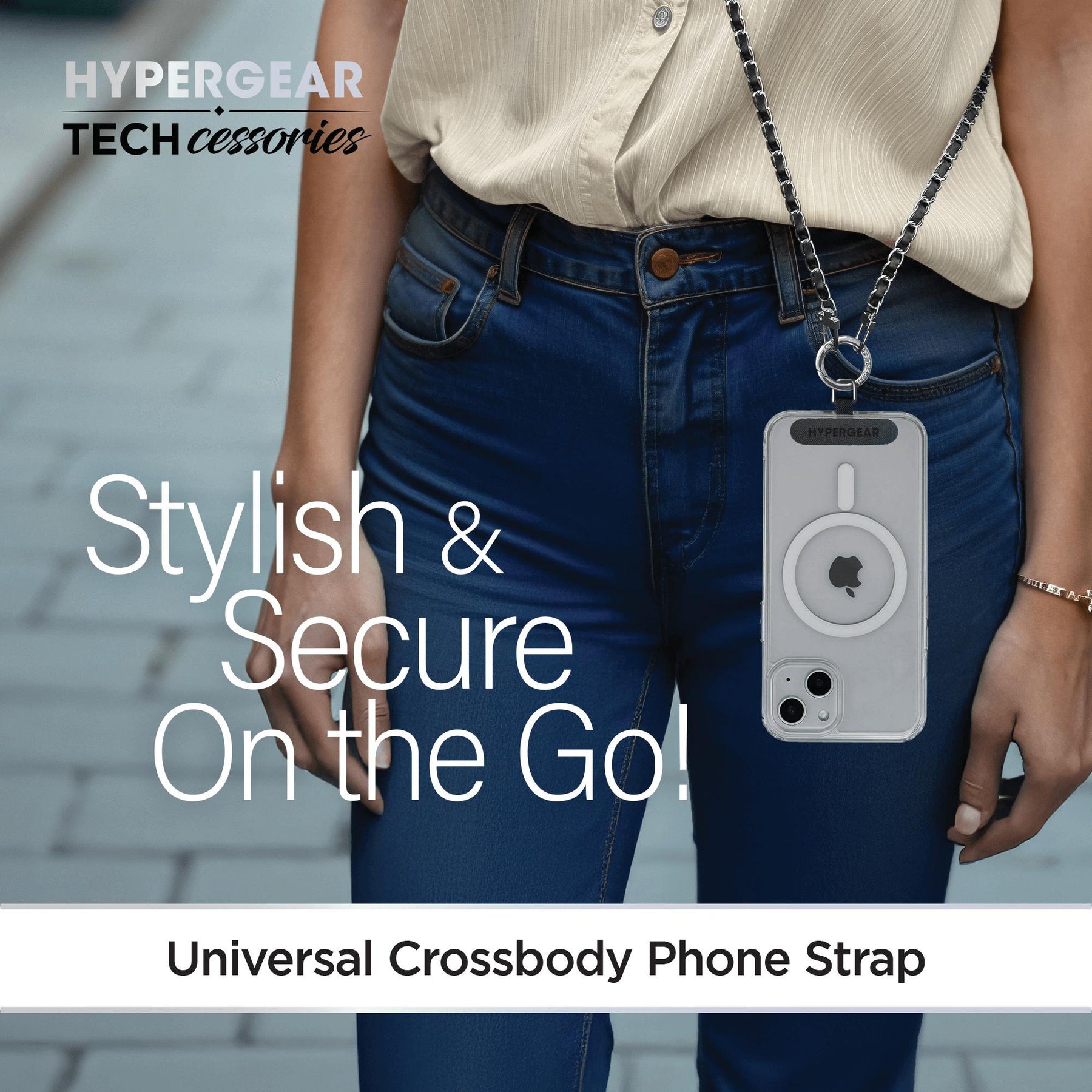 No pockets? No purse? No worries! The HyperGear TECHcessories Silver Chain with Black Vegan Leather Universal Crossbody Phone Strap keeps your phone within reach and hands-free, without sacrificing style.