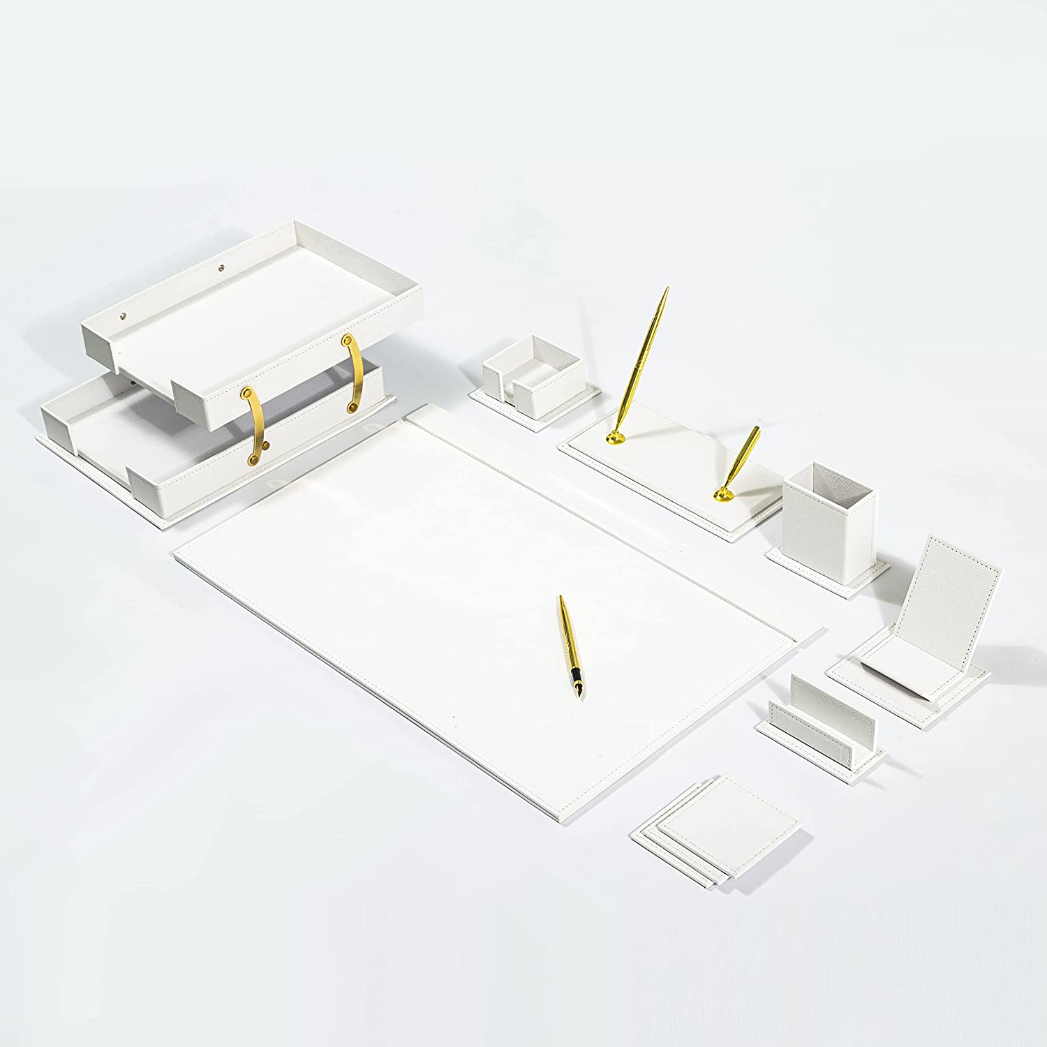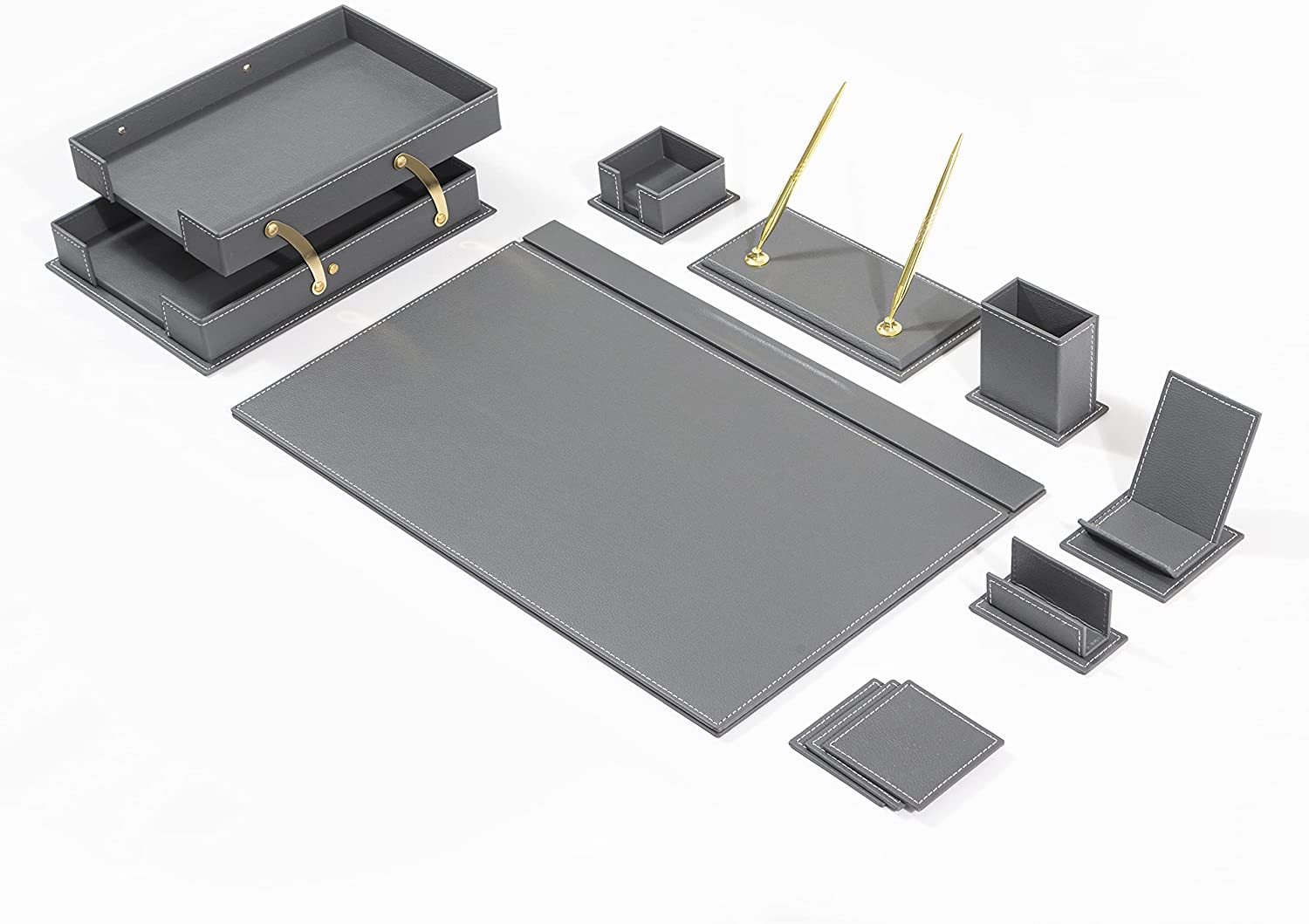 • Effortless organization — includes a mobile phone holder, desk pad with cover, coasters, business card holder, gold pen set case, note paper holder, pen holder, and two document trays to keep essentials within reach and your desk clutter-free.