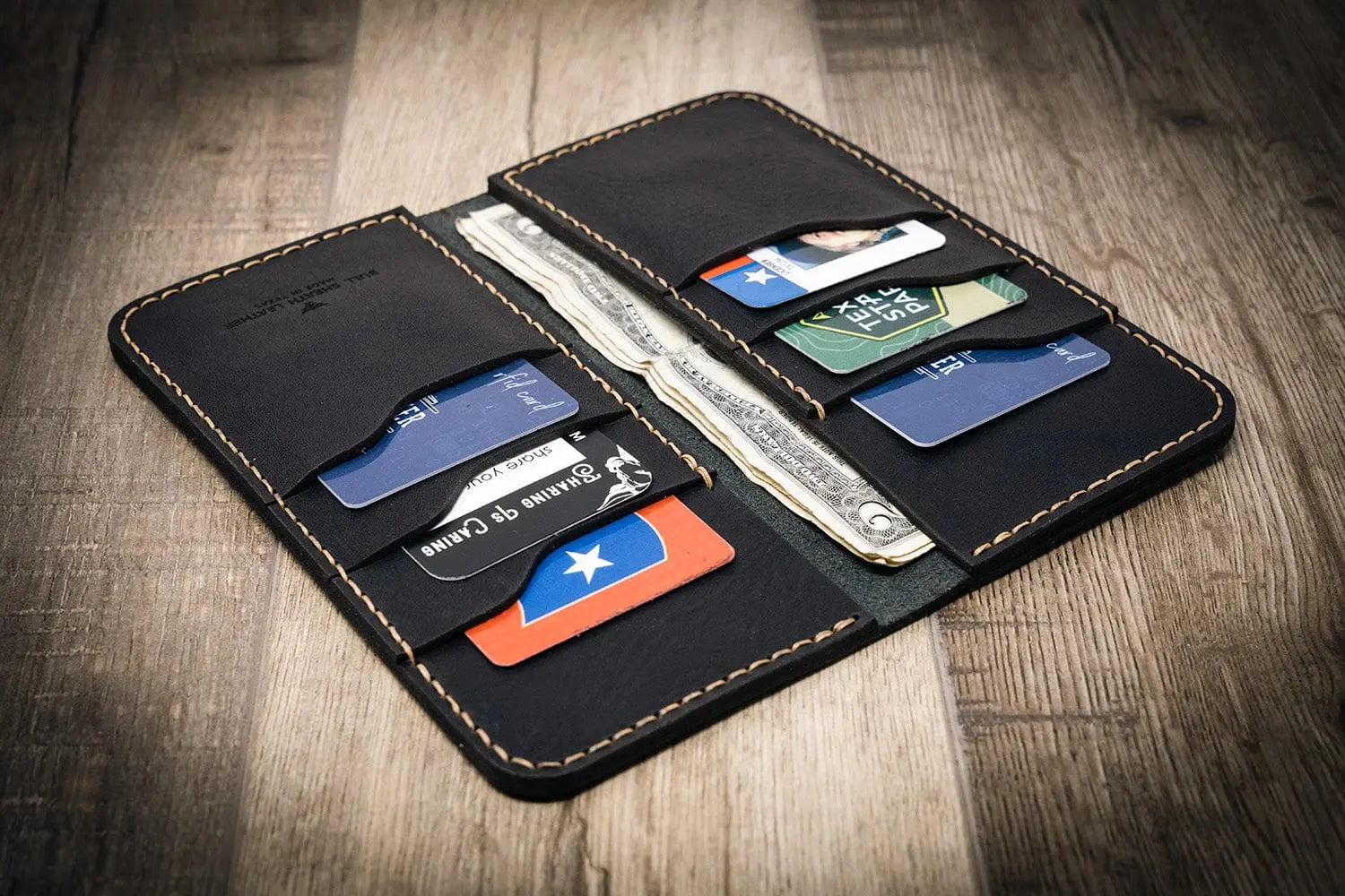 Meet the Western Long Wallet in Black — a tall bifold built for men who want serious storage with a touch of frontier flair. This handmade piece will provide you with an everyday carry as big as Texas.