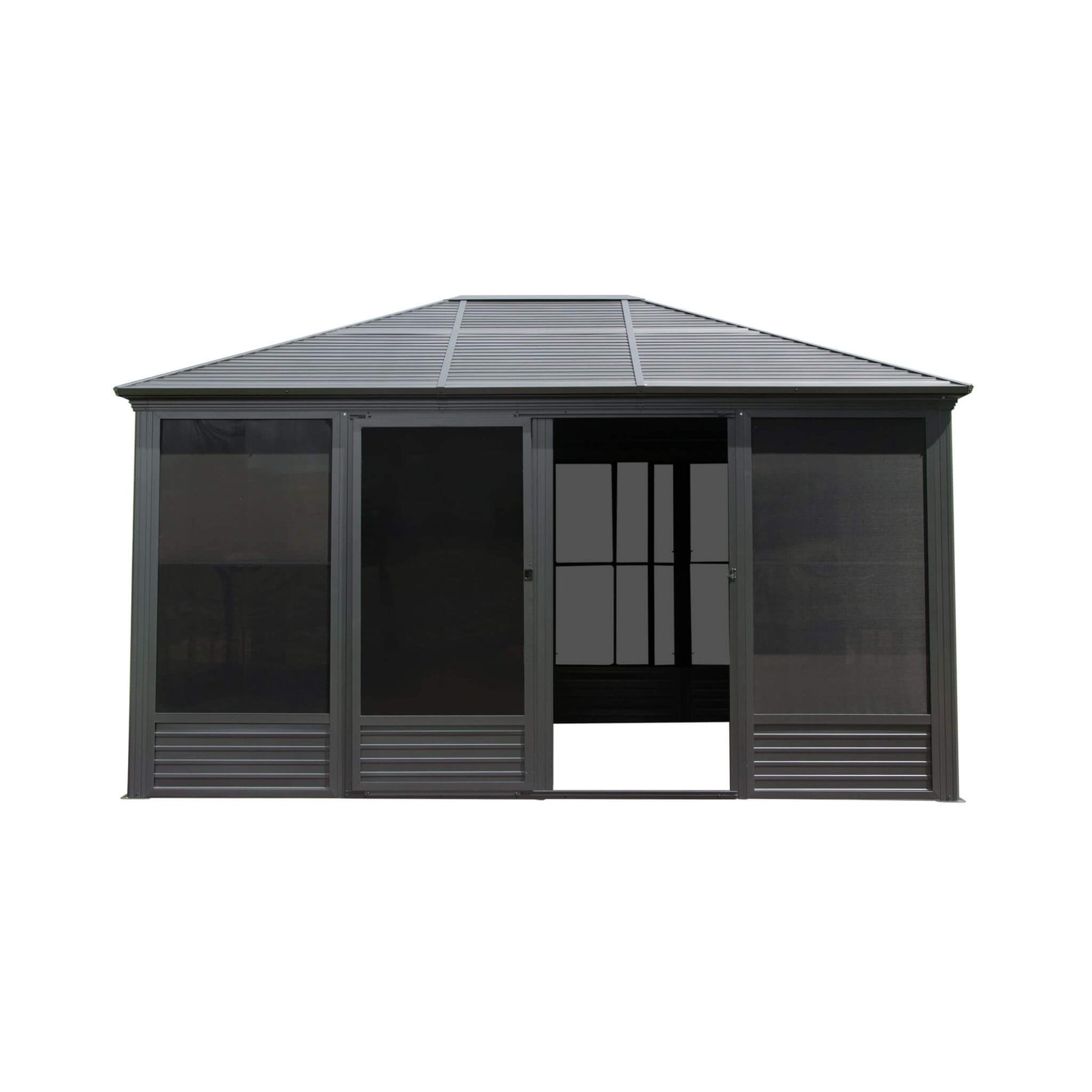 [11X14FT] Premium Four Season Outdoor Aluminum Hardtop Gazebo Sunroom With Galvanized Steel Roof, Sliding Doors And Movable PVC Screen Walls (SAK88776)
