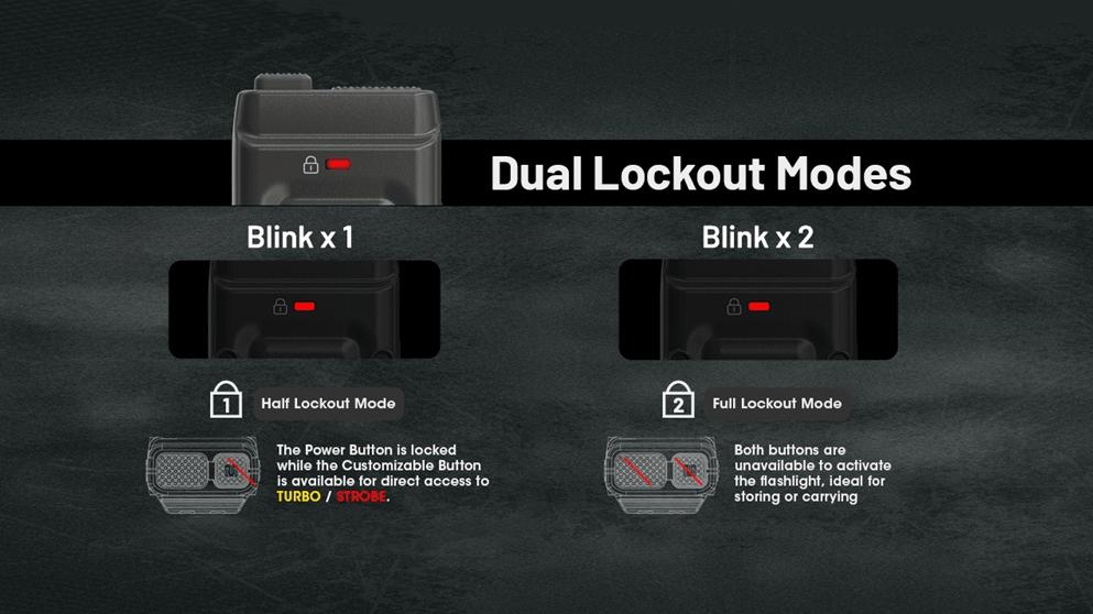• Lockout Modes: Half and Full. In Half Lockout you can still access Turbo or Strobe; Full Lockout fully prevents activation