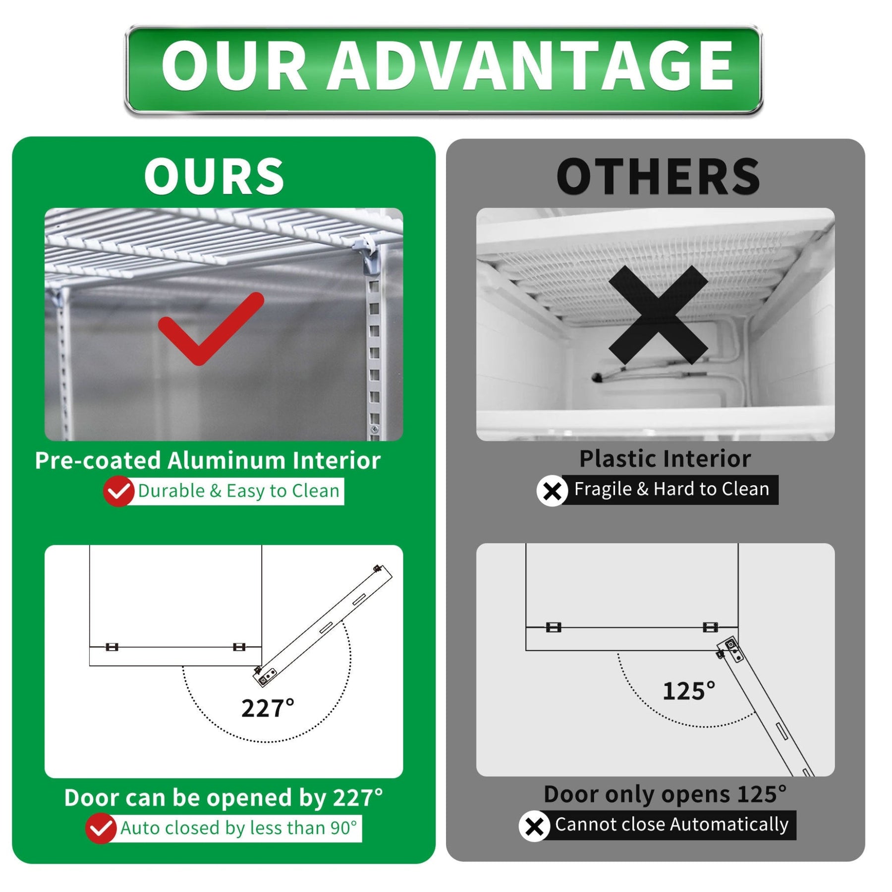 • Access & door features: Opens up to 227° for easy access, automatically closes below 90° for convenience, and features a recessed handle with magnetic gasket for airtight preservation.