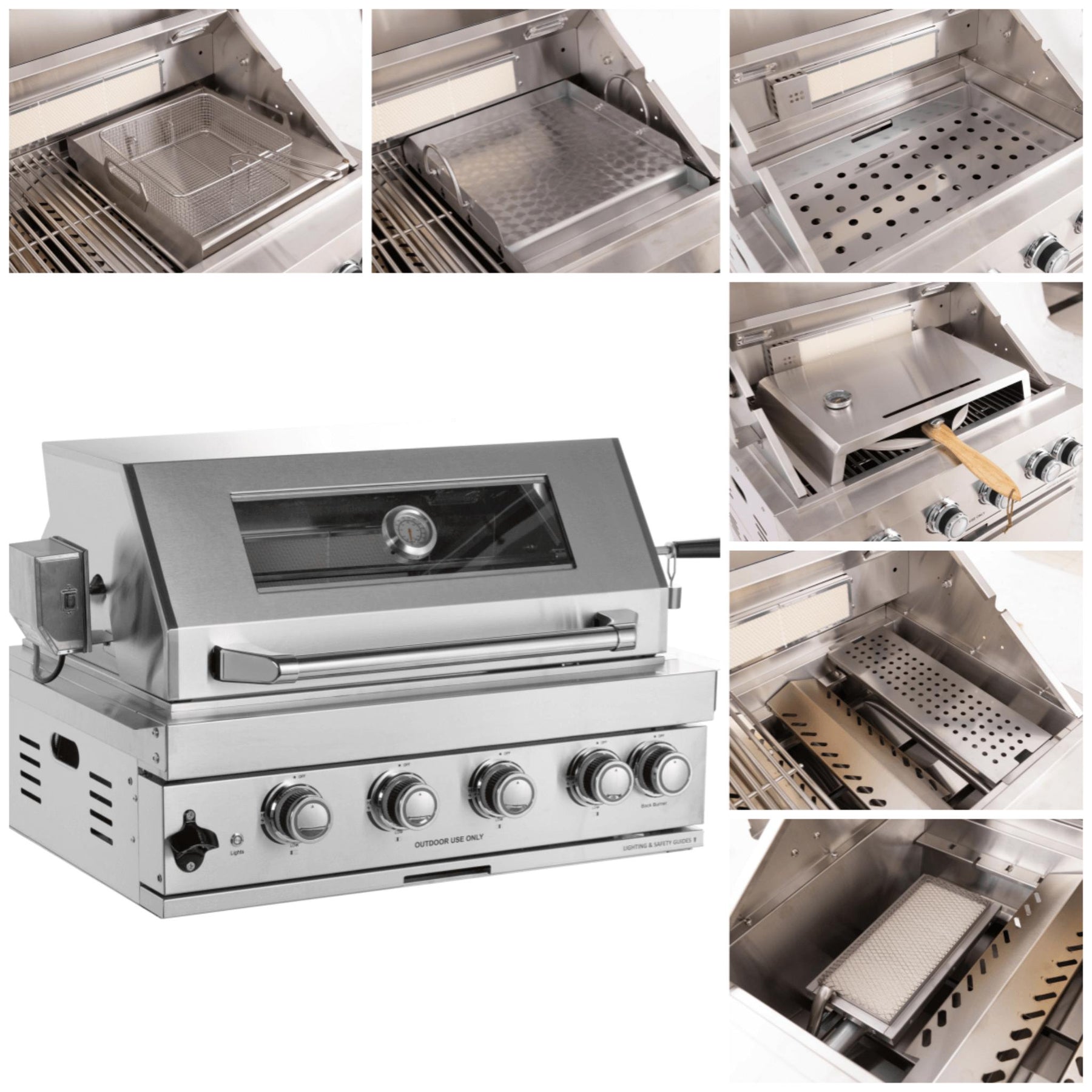 • 32-inch stainless steel LPG gas grill with 60,000 BTU output, 4 cast stainless steel burners, and an infrared rear burner delivers top-notch performance.
