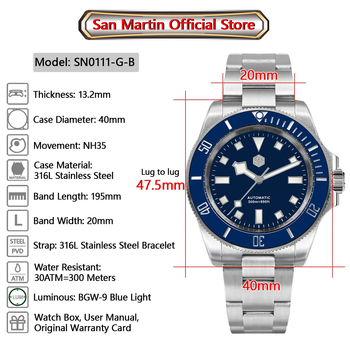 San Martin 40mm Stainless Steel Classic Men Diver Watch Japan NH35 Automatic Mechanical Sapphire Waterproof 300m SN0111
