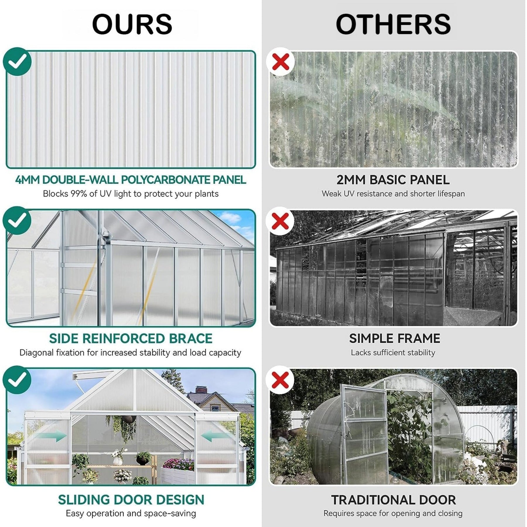 • The durable aluminum alloy frame and reinforcing rods on the sides, paired with the double-wall polycarbonate boards, ensure superior UV protection.