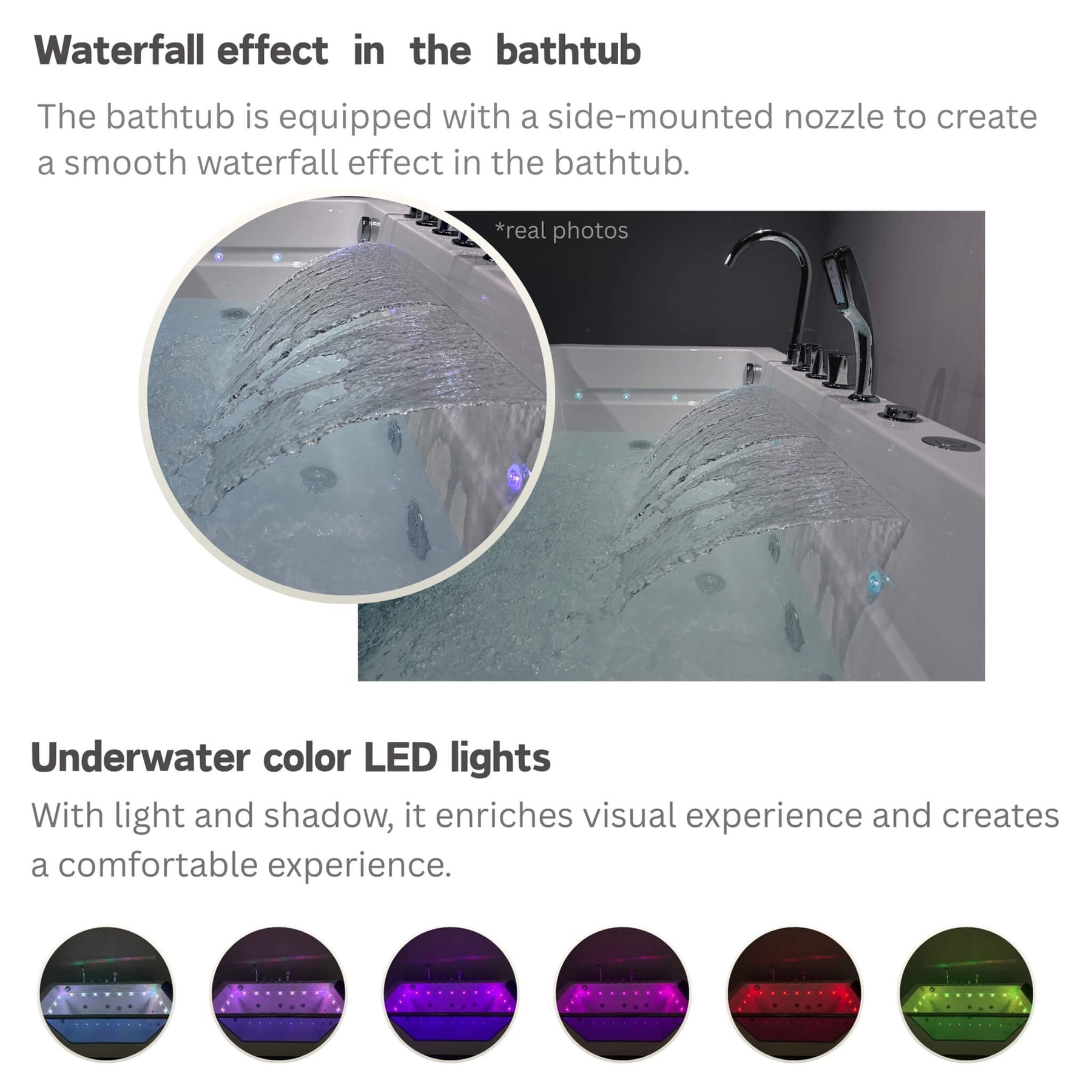 • Glass panel: A sleek glass panel elevates the tub’s contemporary style and enhances chromatic whirlpool effects for a visually captivating experience.