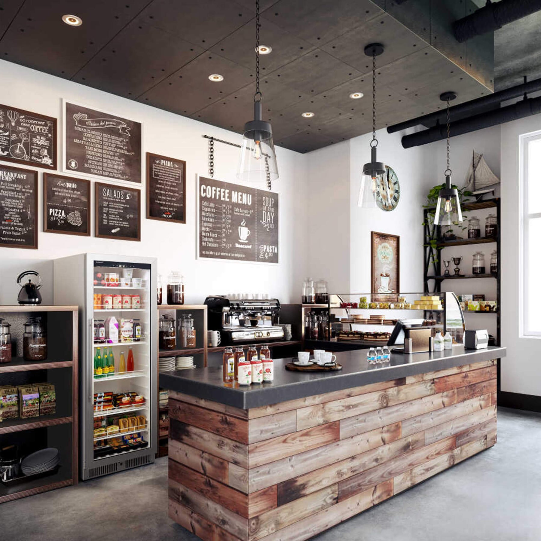 • Lighting: LED lighting showcases beverages beautifully