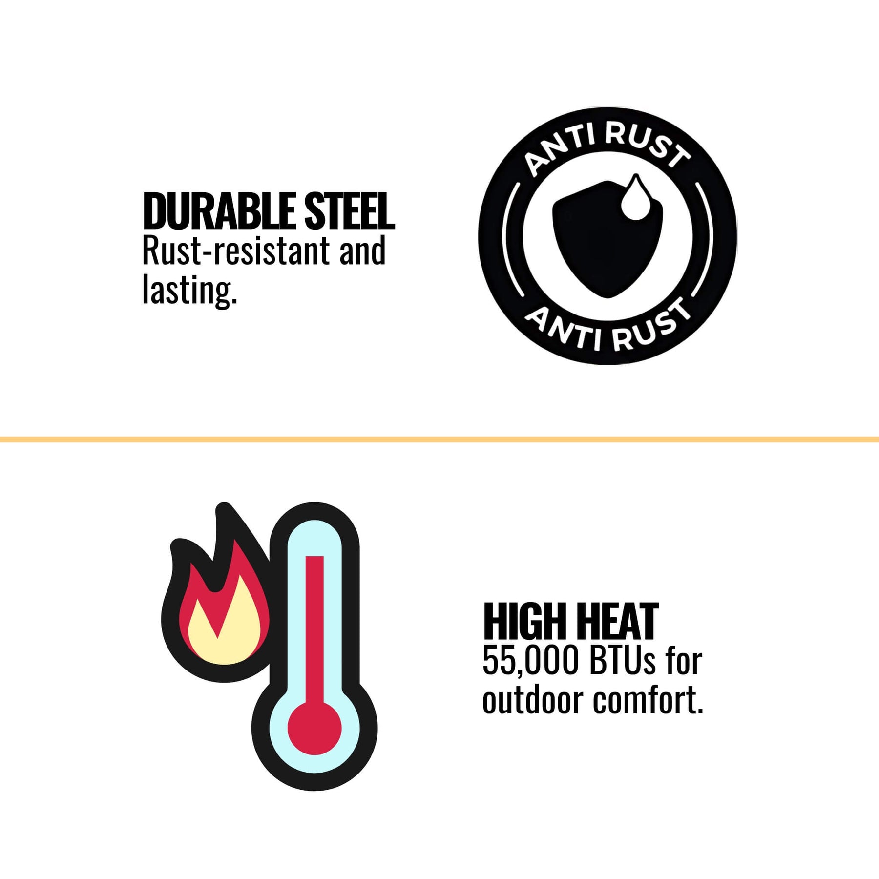 • Power & warmth: Up to 55,000 BTUs for ample outdoor heating, so chilly nights don’t stand a chance.