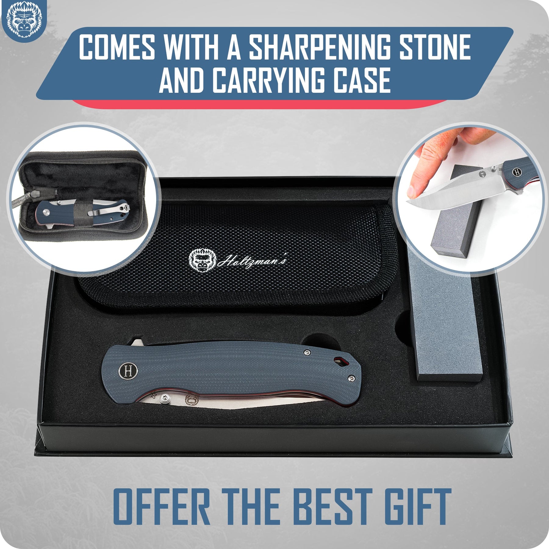 • Get your hands on a complete pocket knife kit: the sharpening stone will make sure your blade is always razor sharp and the carrying case will keep your EDC knife safe and always at hand.