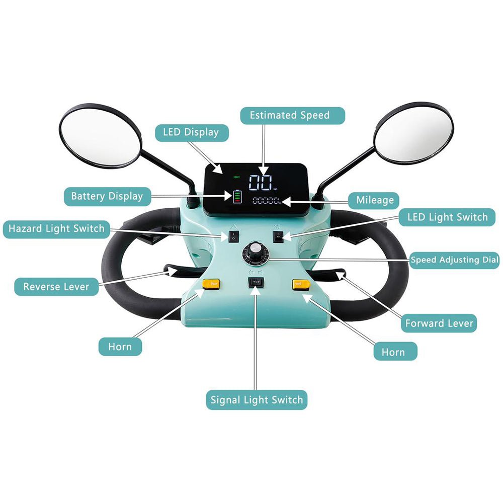 • Smart visibility & safety: LED console with precise, legible speed, mileage, and battery data; treaded pneumatic tires (10 inches wide) for confident handling on varied surfaces; headlights, signal lights, brake lamps, side running lights, and side mirrors keep you seen and safe.