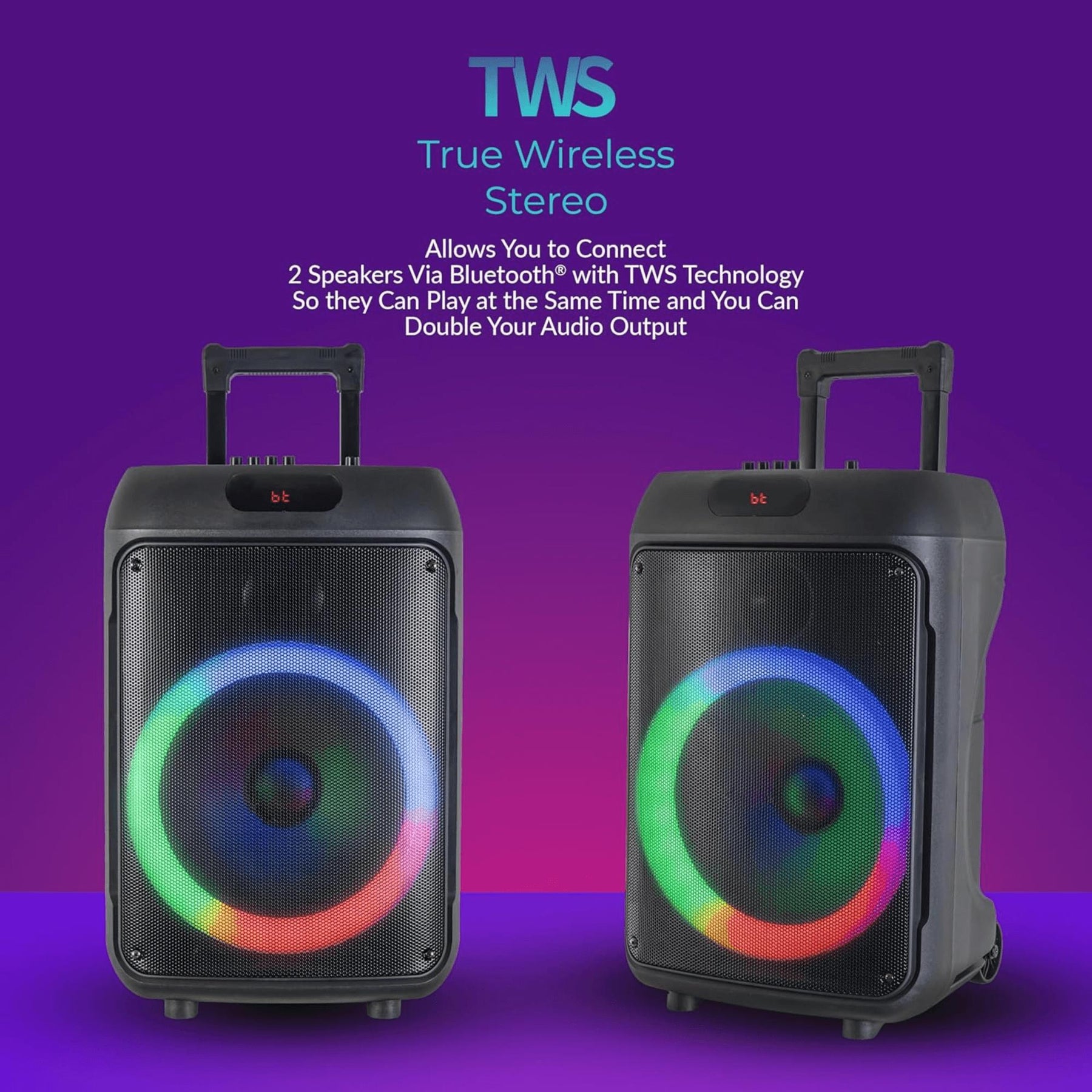 Stream wirelessly with Bluetooth and True Wireless Stereo (TWS), record moments, and light up the room with built-in LEDs to match the beat.