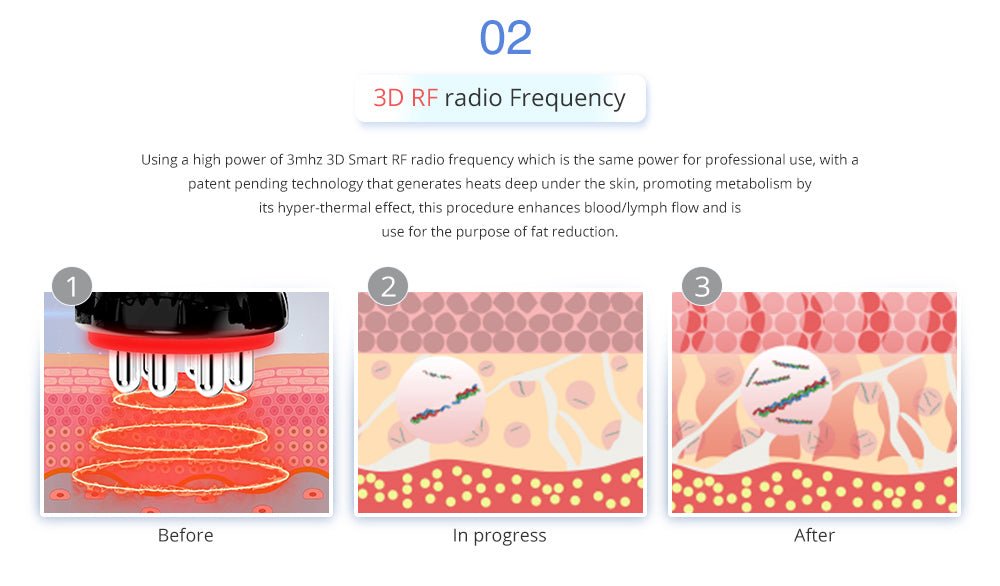 • Radio Frequency (RF) Therapy: Body: Frequency 3MHz, Power up to 30W; Face: Frequency 3MHz, Power up to 30W