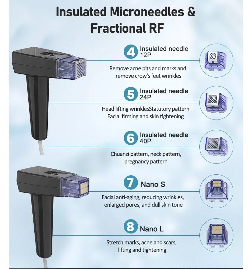 • Insulated Micro-Needle RF Heads:3 (12 pins, 24 pins, and 40 pins)