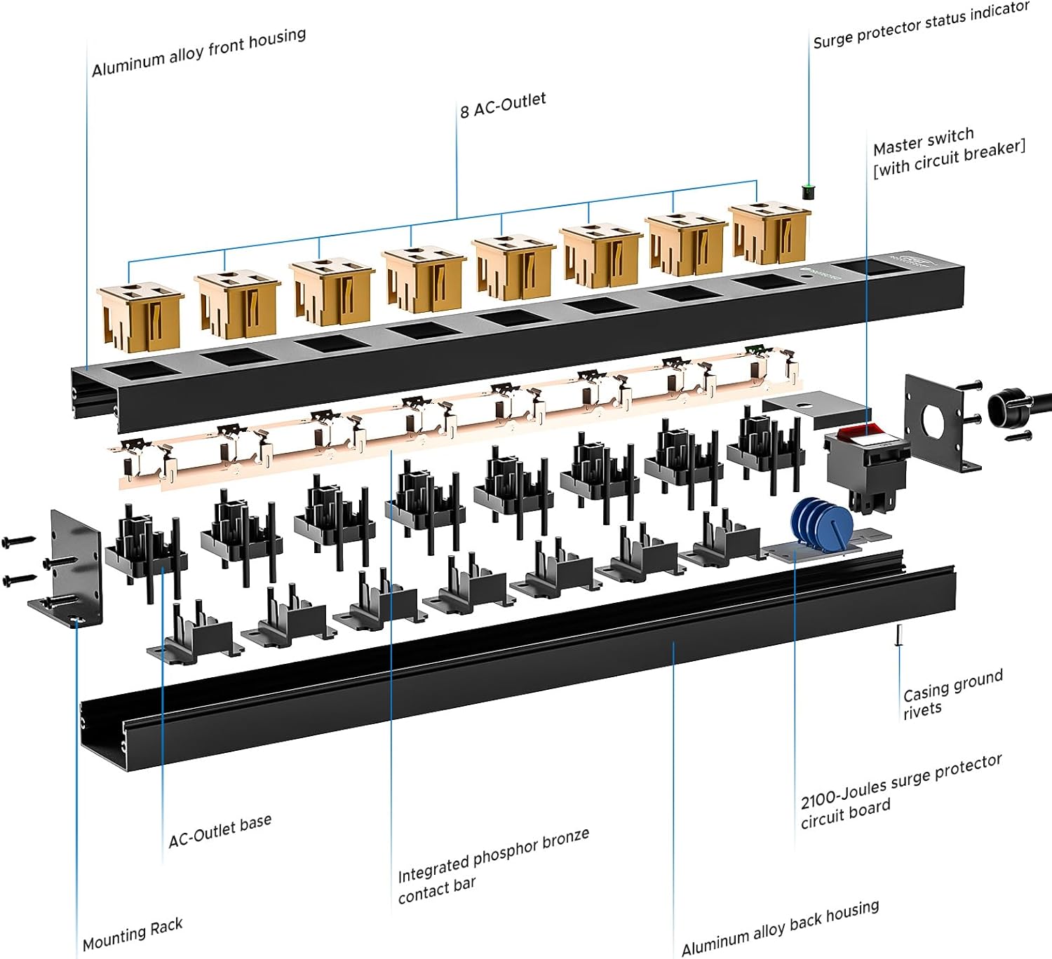 • Two-Pack, Eight Outlets — Includes two metal power strips with eight outlets total, designed with 1.7-inch center-to-center spacing to fit bulky plugs.