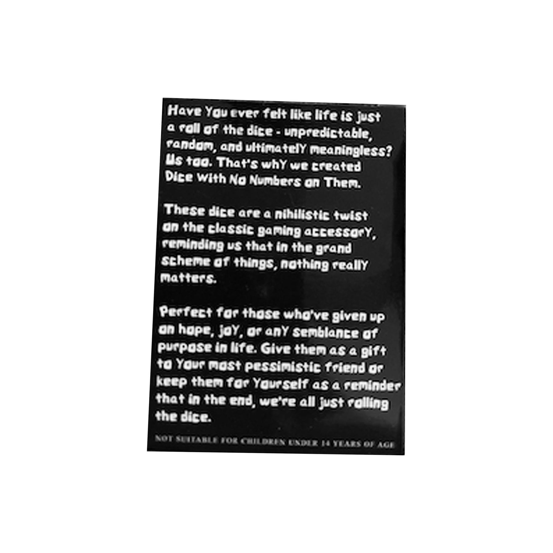 Two dice with no numbers on them—it's a cheeky twist for game nights and gift swaps. A gag gift that invites improvisation, curiosity, and plenty of laughs.