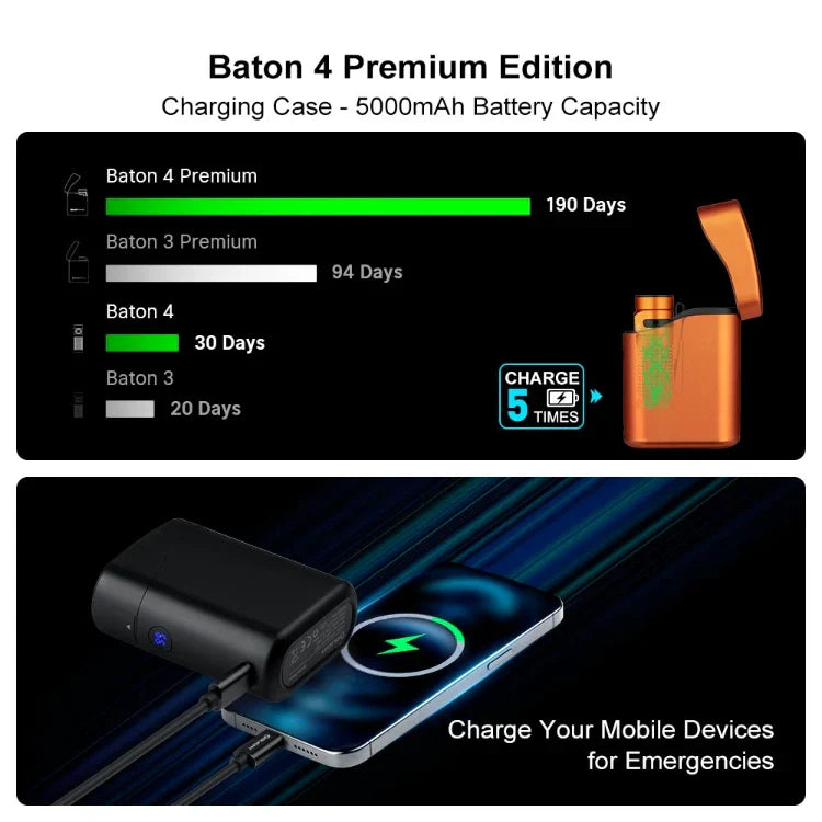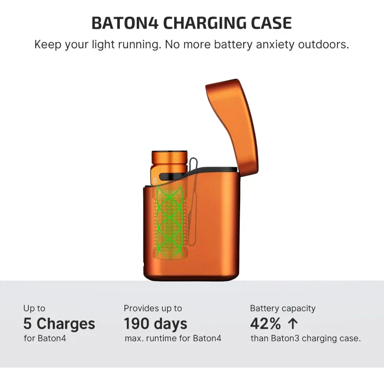 • Premium Edition — One Case, One Universe — Powered by a 5000mAh battery, the case can fully charge the Baton 4 flashlight 5 times, giving a max runtime of 190 days. It can also charge your mobile devices in emergencies with its USB-C port.