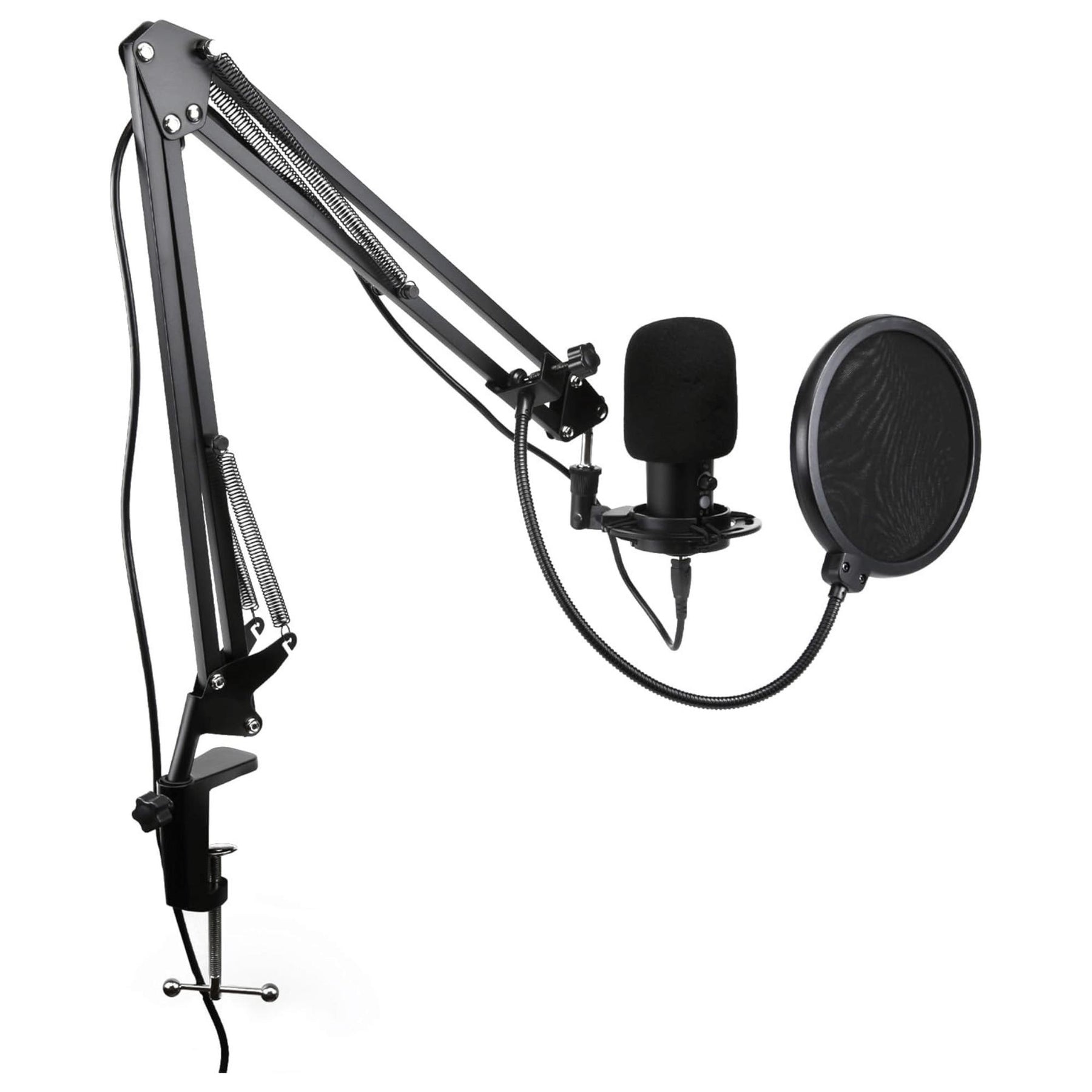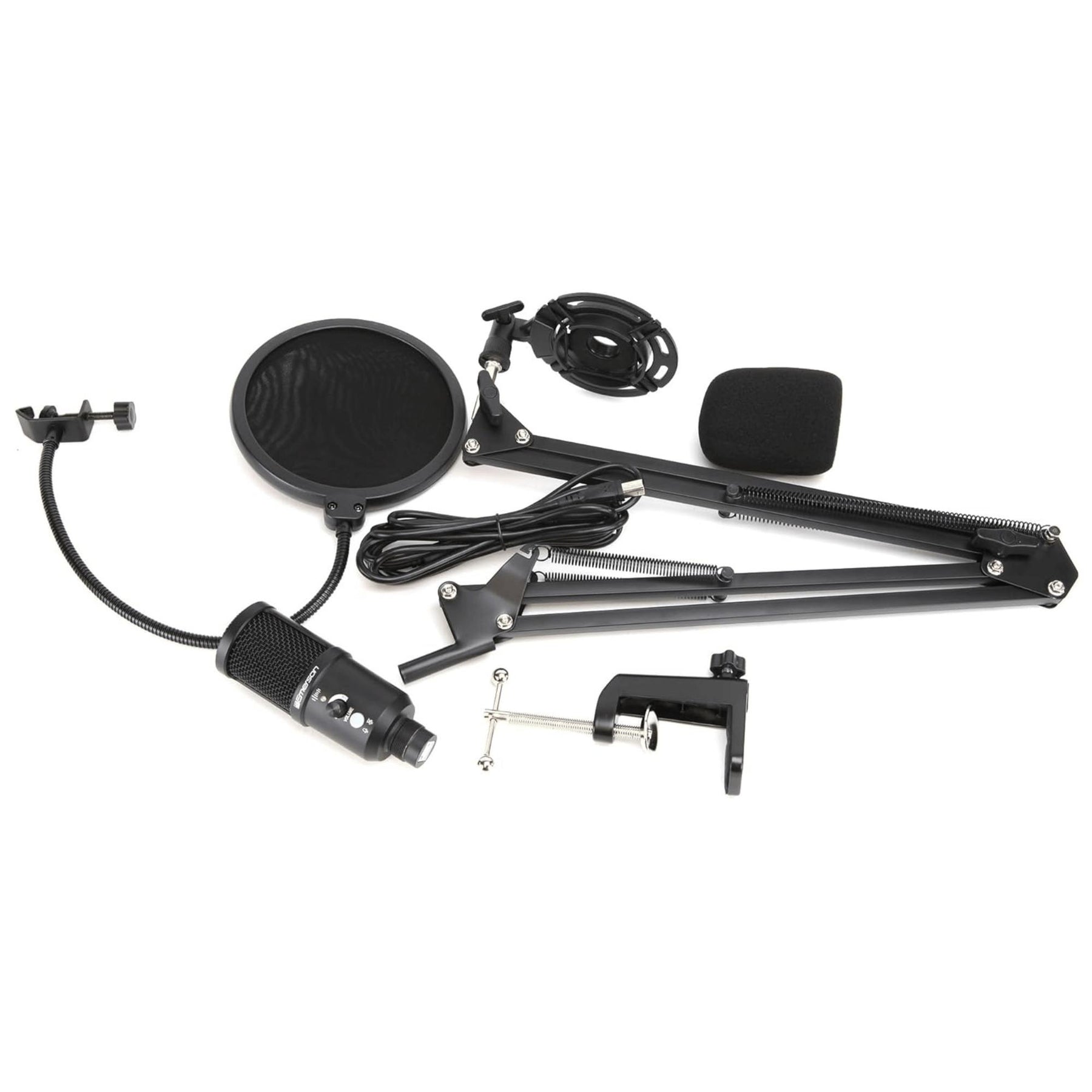 • Accessories included: USB Microphone, Cable 2.7M, Arm Stand with Base, Foam Microphone Cover, Pop Filter, Shock Mount.