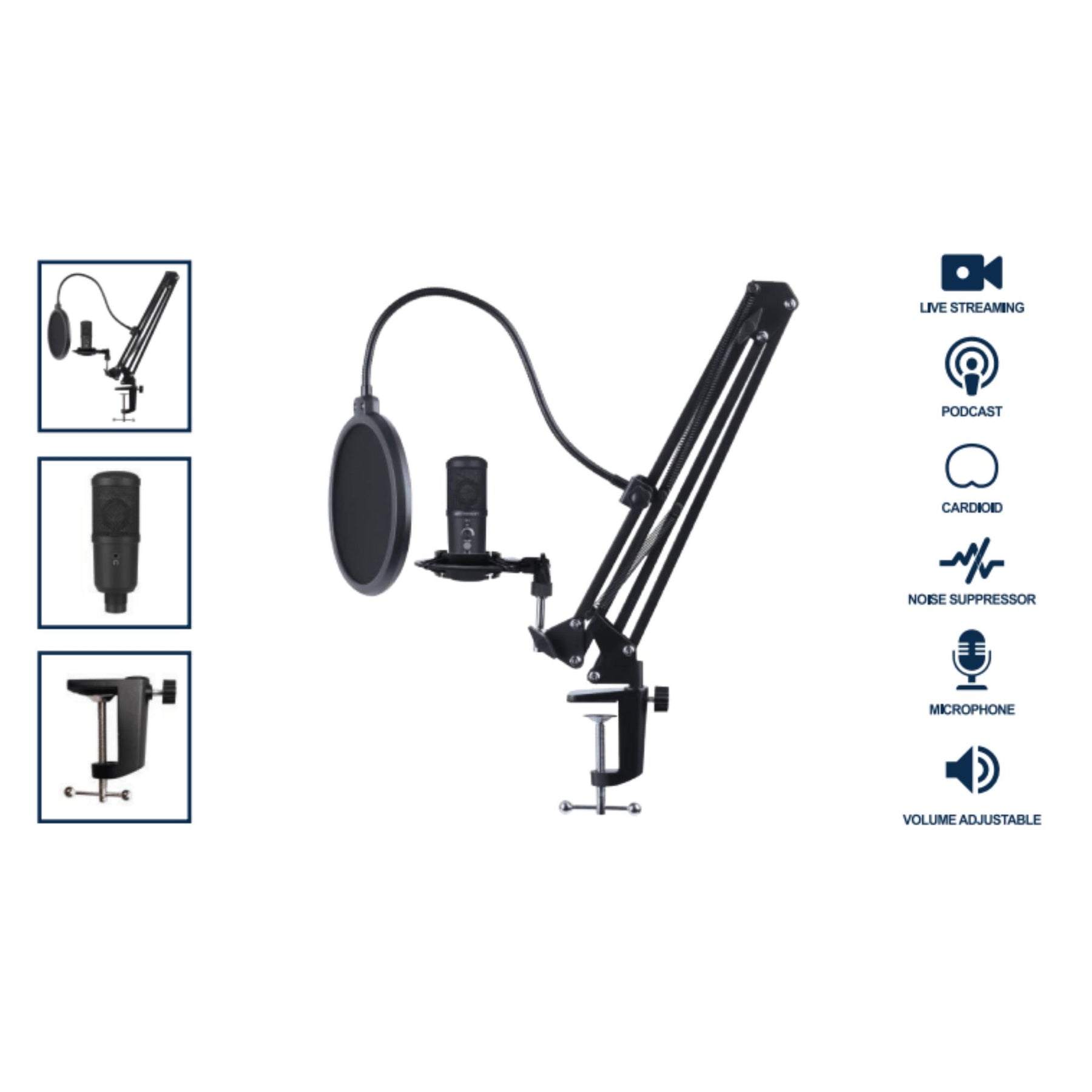 • Accessories included: USB Microphone, Cable 2.7M, Arm Stand with Base, Foam Microphone Cover, Pop Filter, Shock Mount