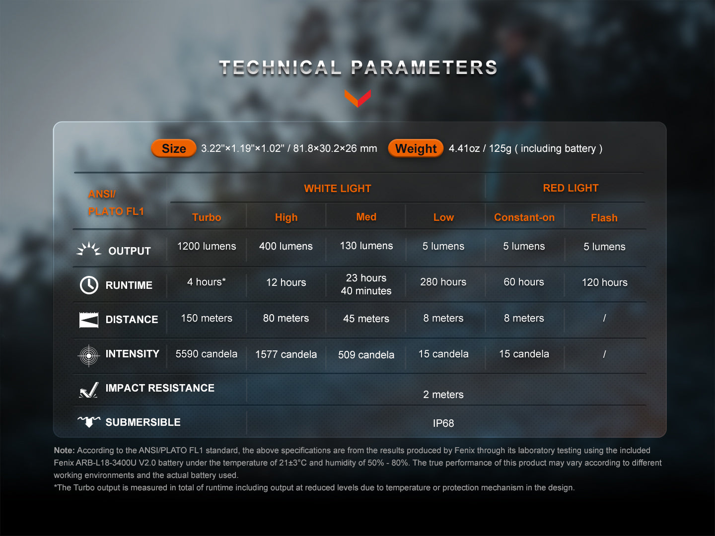 • Power and runtime — 1200 lumen output, illuminating up to 150 meters, with a substantial 23.7-hour maximum runtime.