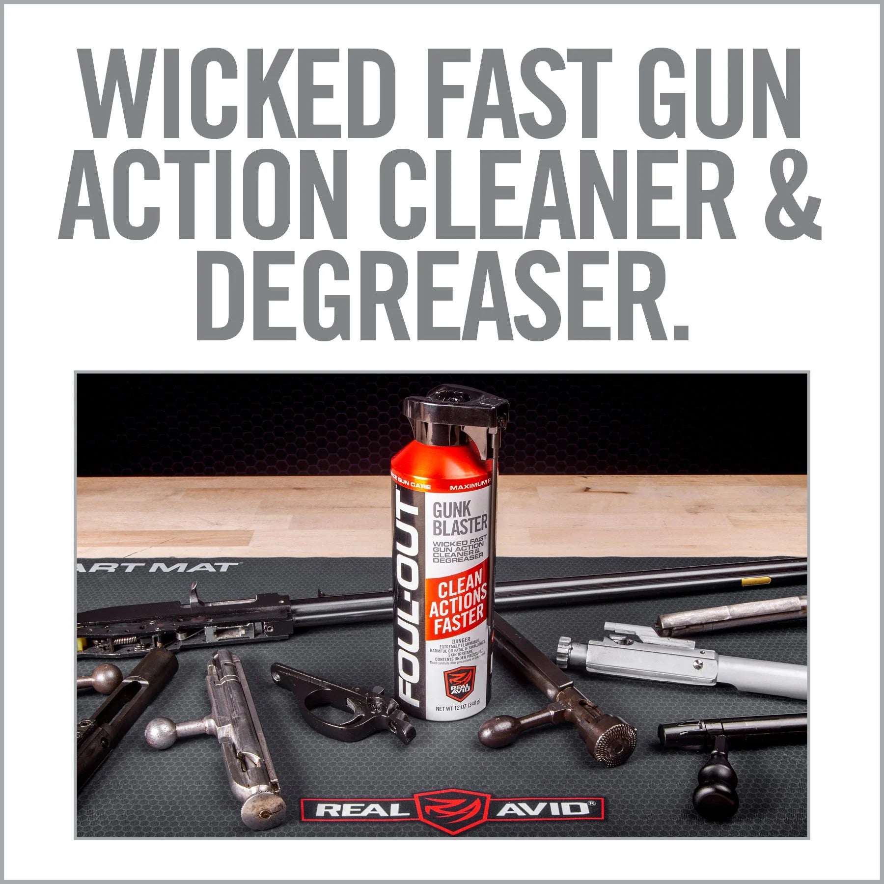 Introduction Foul-Out Gunk Blaster blows away grease and grime fast. This powerful gun- metal grade solvent quickly strips gun actions of burnt powder, oil and grease, eliminating malfunctions of moving parts due to fouling and build up.