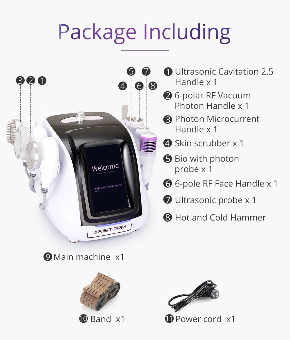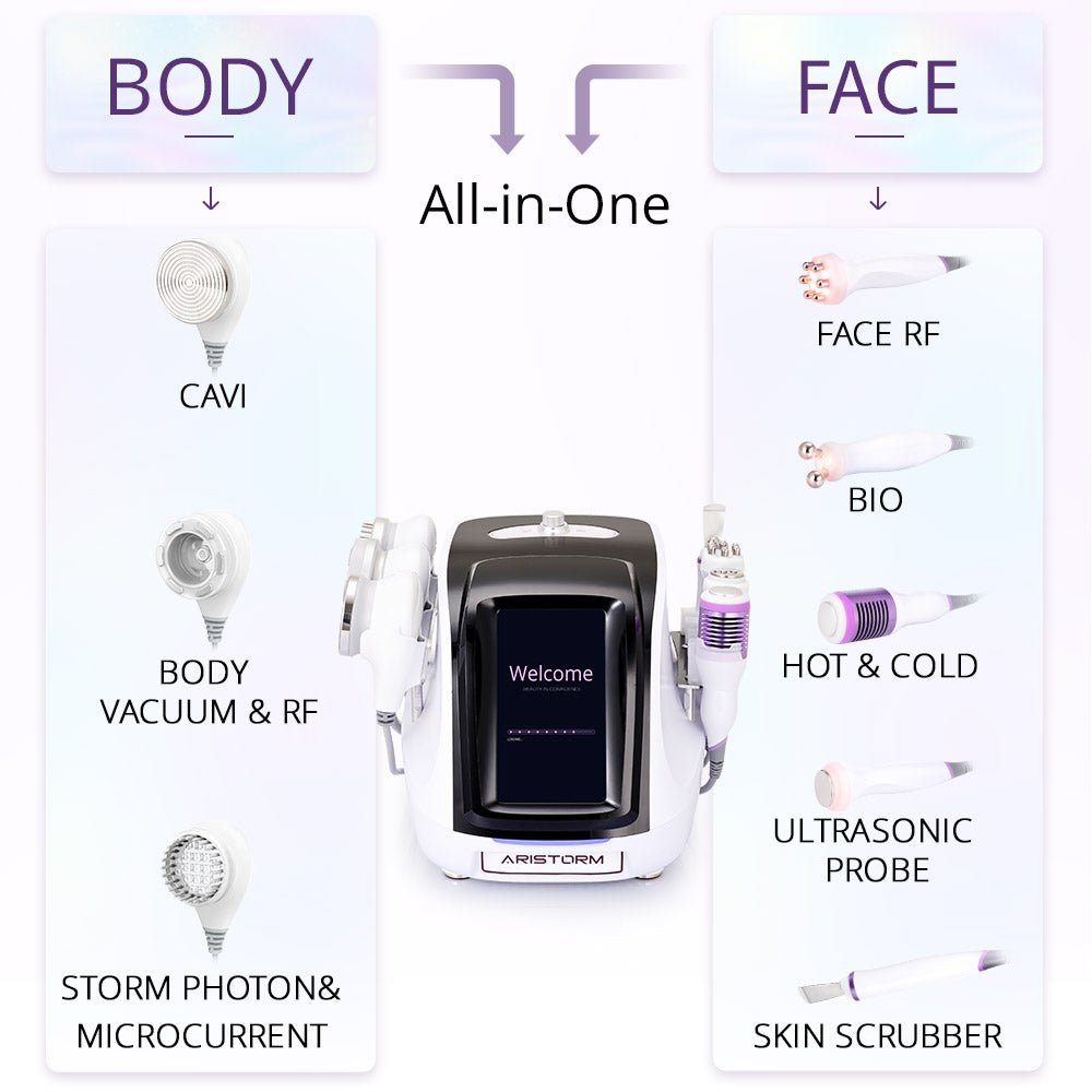 • 8-in-1 Multifunctional System — Combines cavitation, RF, vacuum therapy, microcurrent, and LED light technology for comprehensive body sculpting and skin rejuvenation.
