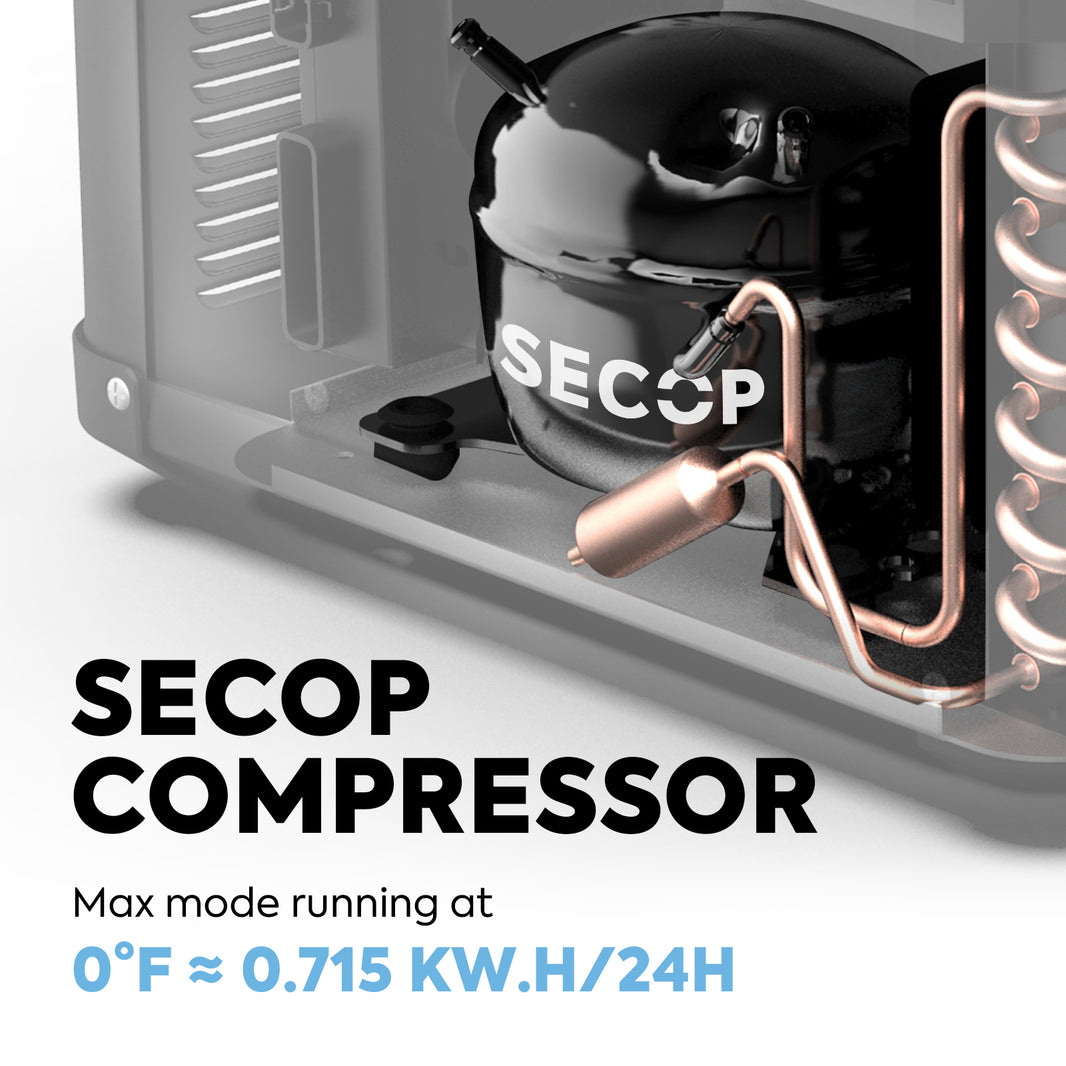 Secop Compressor: Top tier cooling technology, cooling range from 0°F~50°F, to meet the needs of food cold storage, freezer. 5 year warranty on Secop compressor and 1 year for other parts.