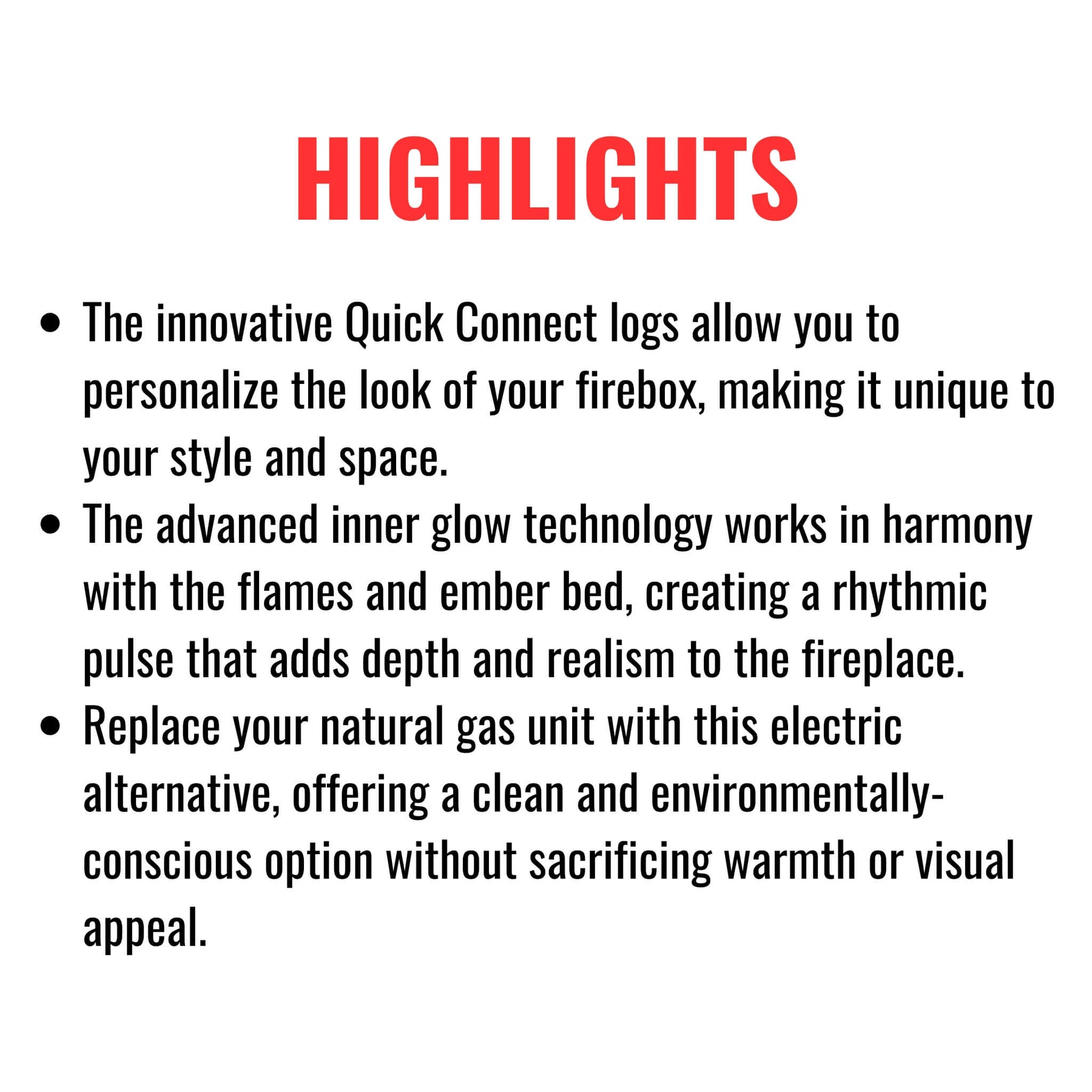 • Quick Connect moveable logs let you personalize the look of your firebox to match your taste.