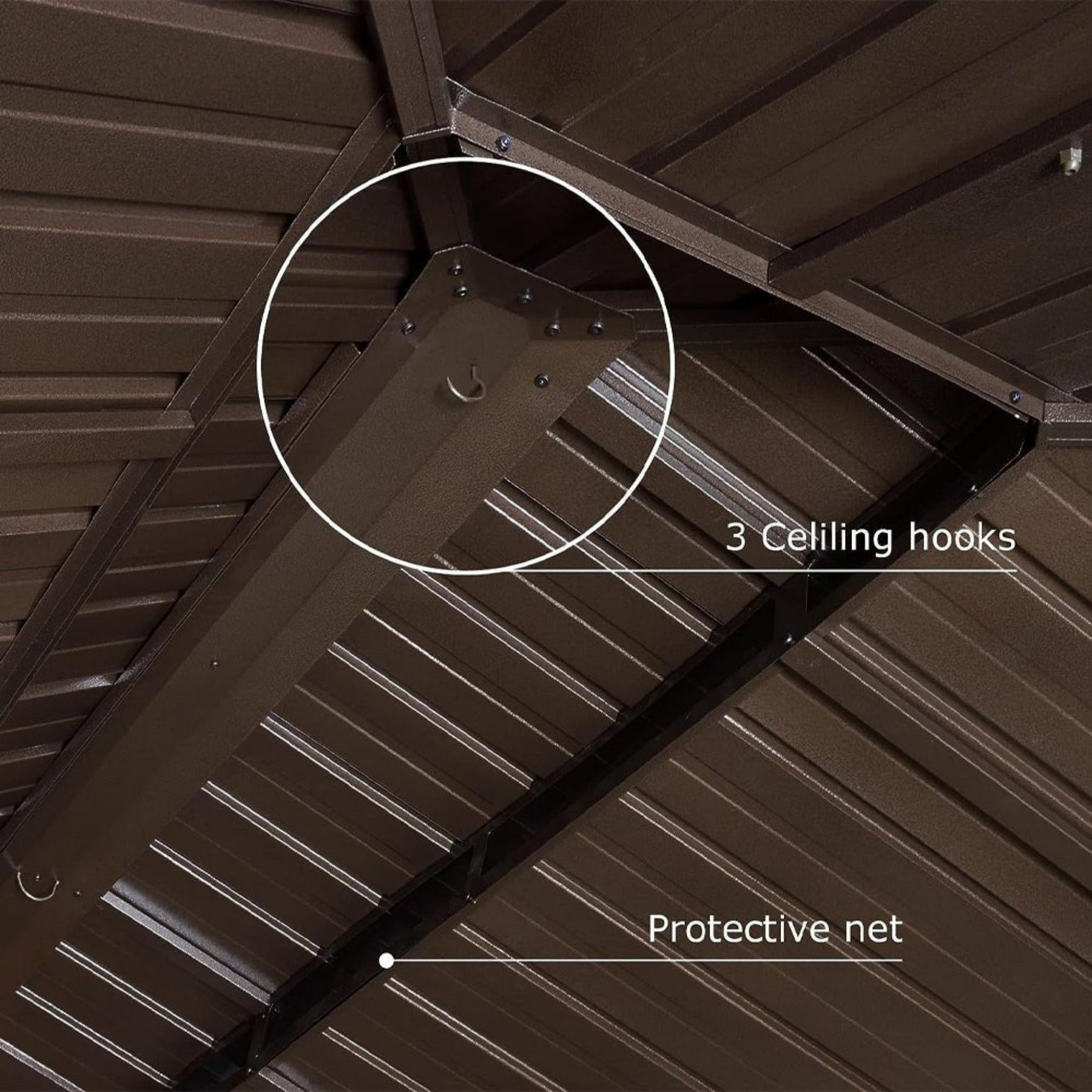 • Hanging options: Solid frame hooks are perfect for hanging a ceiling fan or chandelier inside the patio gazebo.