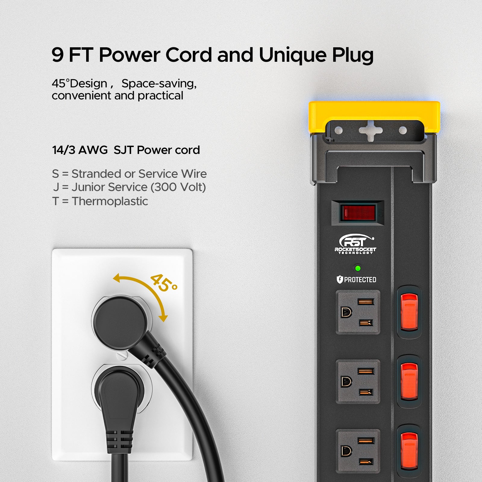 • 9-ft flat plug power cord with 14AWG wire supports up to 1875W and features a built-in 15A circuit breaker and SJT grade wire for better corrosion and oil resistance.