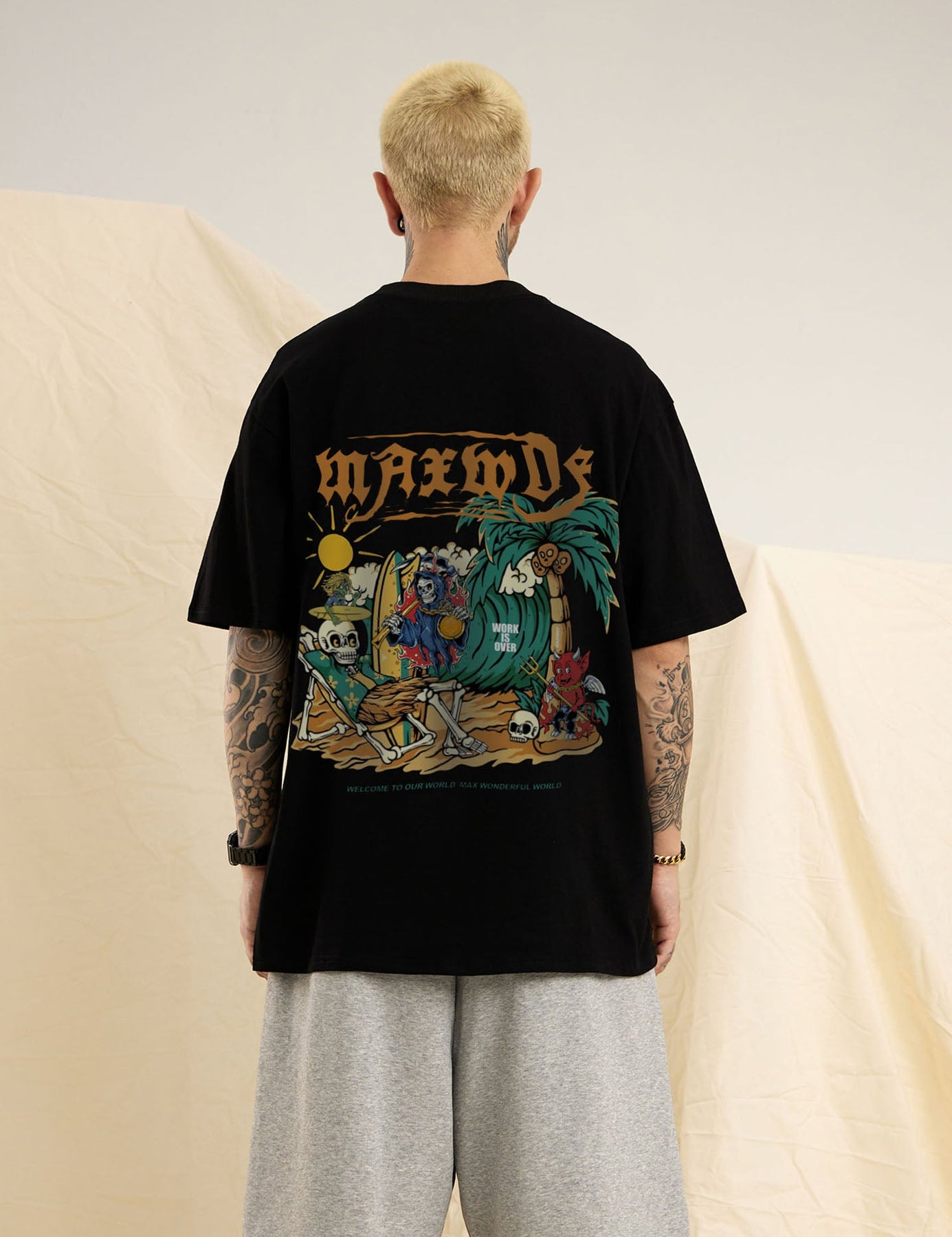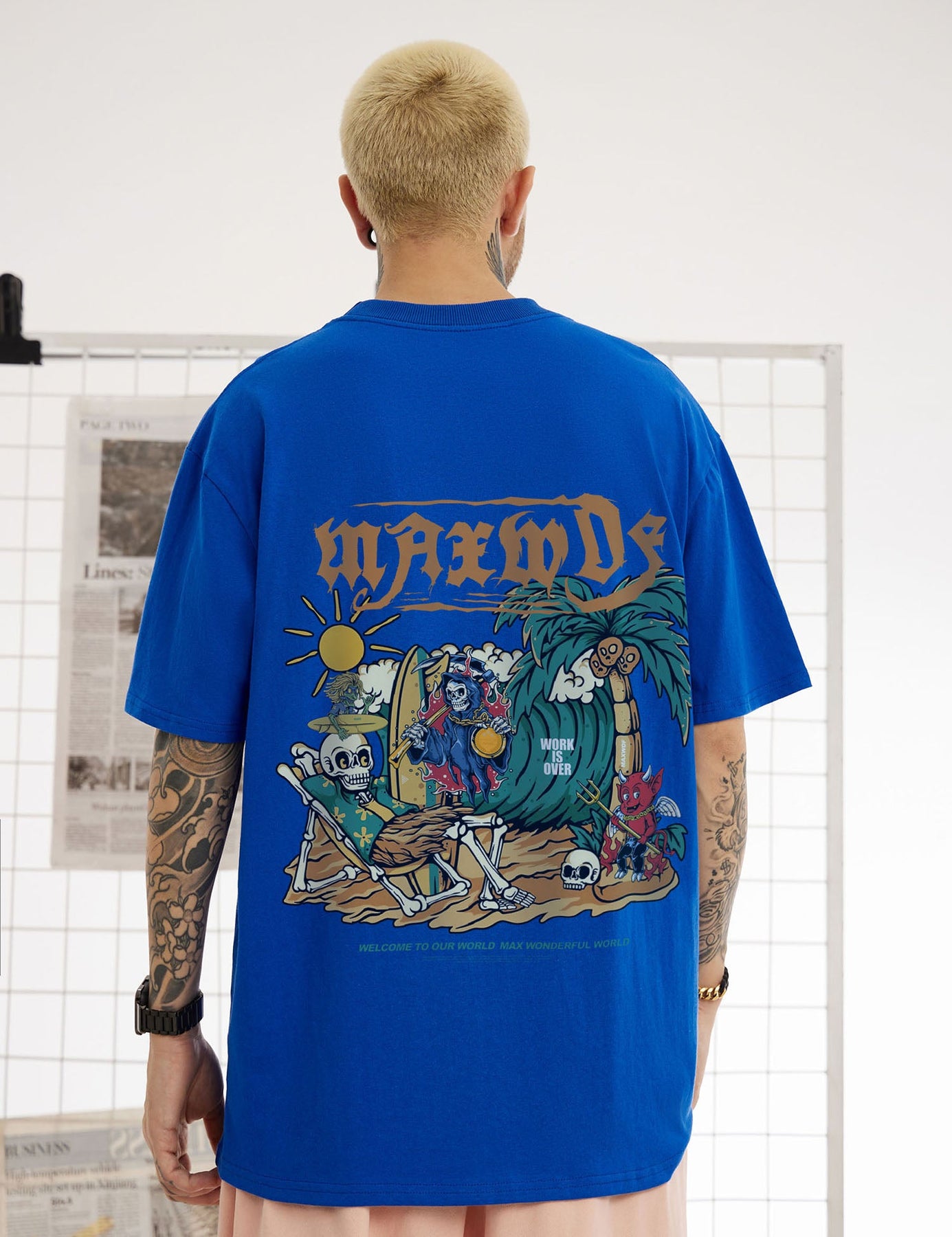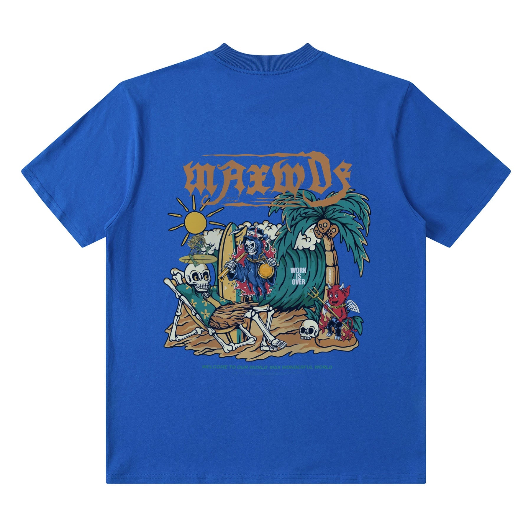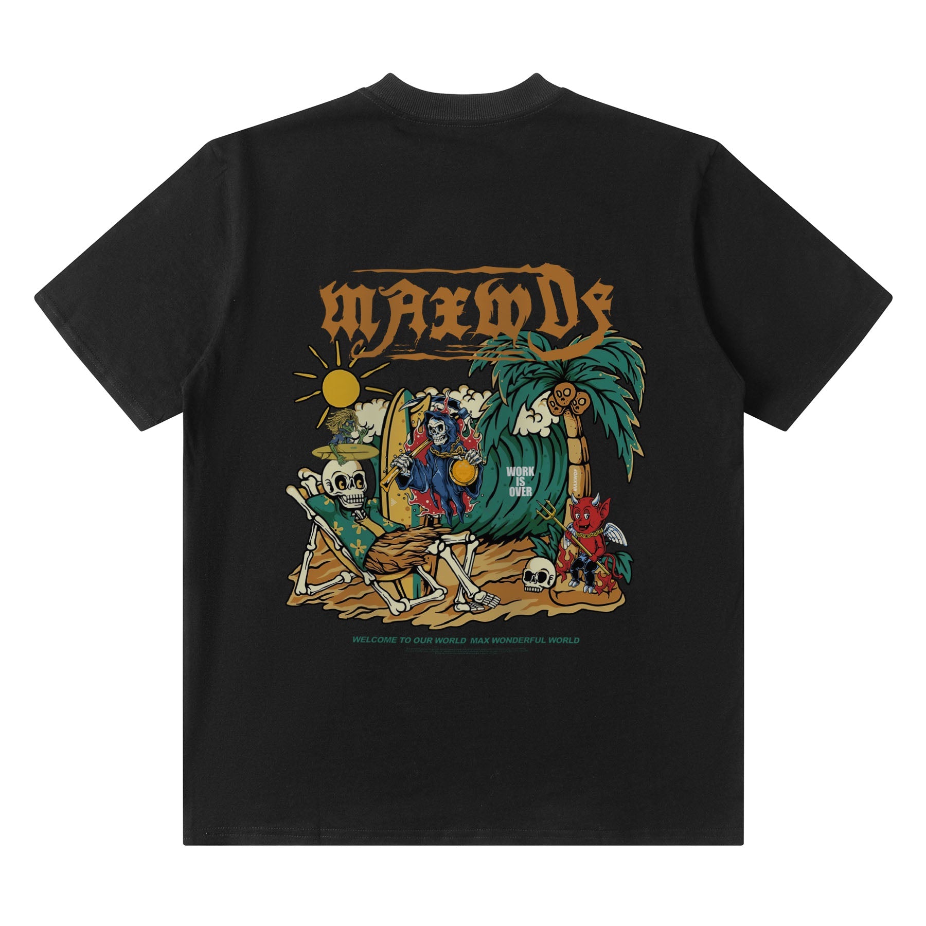 • Graphic artwork of a beach of reapers, skeletons, and skulls to symbolized death and the big waves on the beach titled “Work is Over” and getting ready to drown everything on this beach to save the souls from a long day of work
