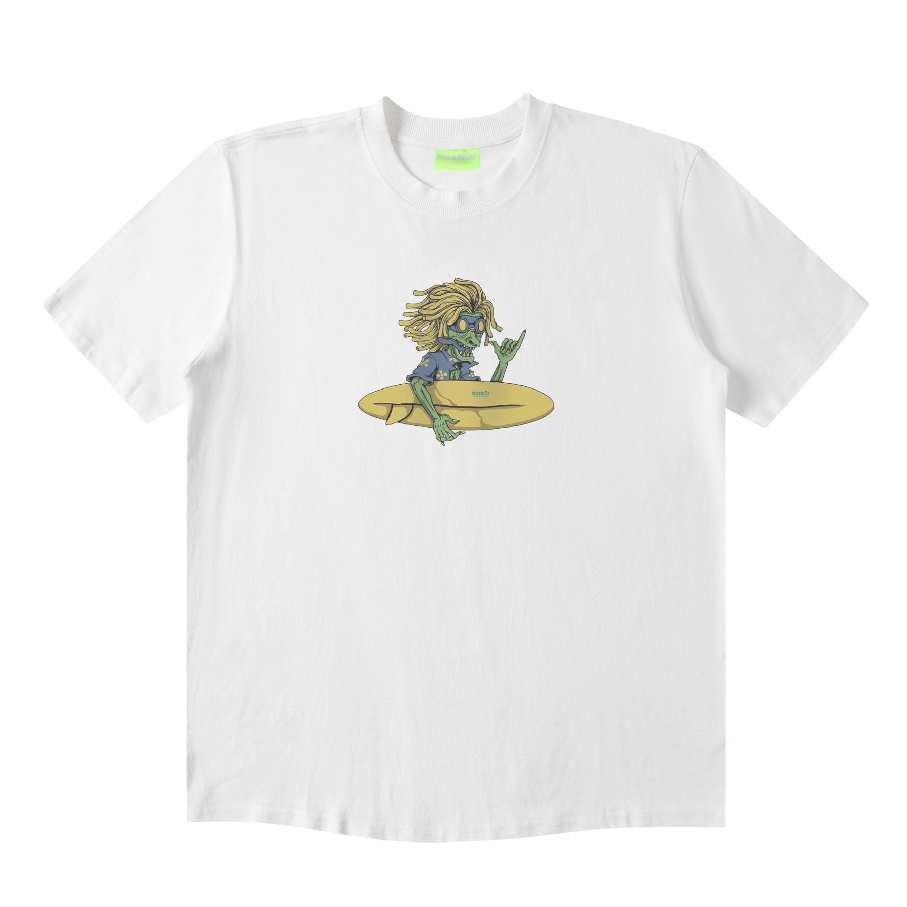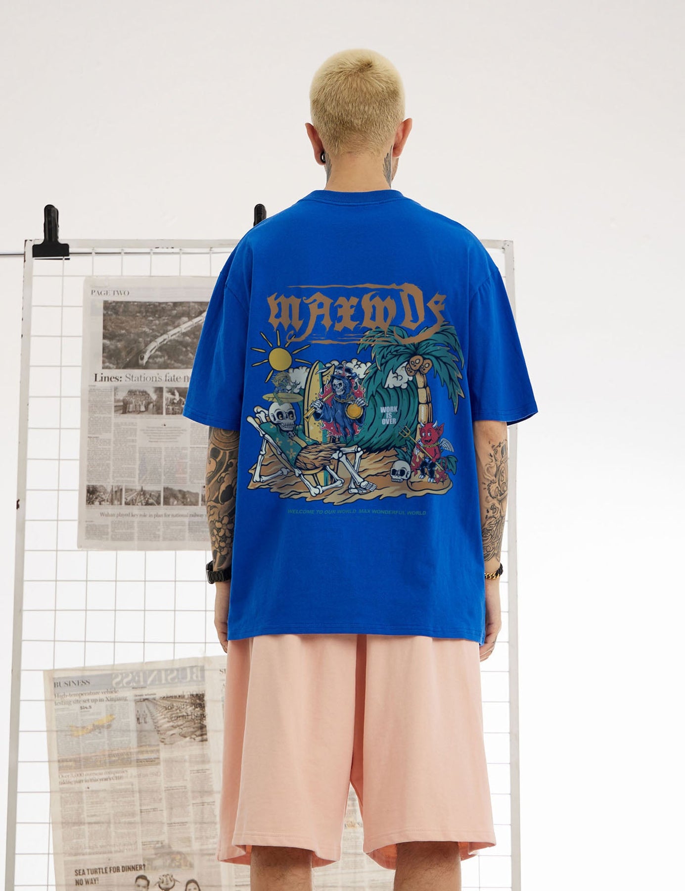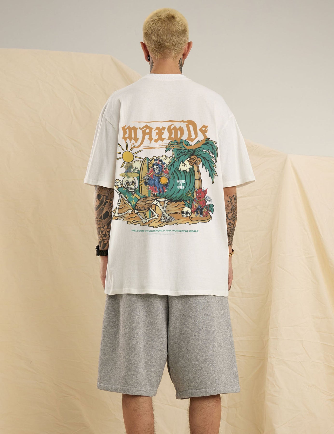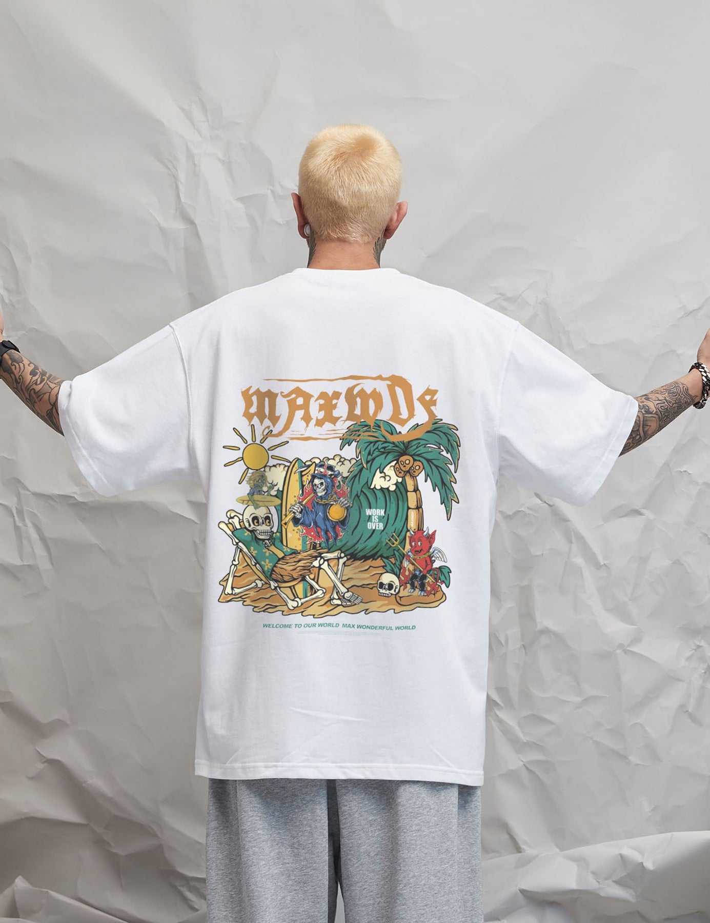 • Graphic artwork of a beach of reapers, skeletons, and skulls to symbolized death and the big waves on the beach titled “Work is Over” and getting ready to drown everything on this beach to save the souls from a long day of work
