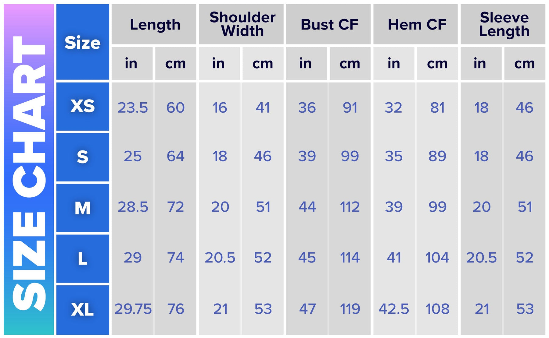 Size Weight (lbs) Length (in/cm) Shoulder Width (in/cm) Bust CF (in/cm) Hem CF (in/cm) Sleeve Length (in/cm)