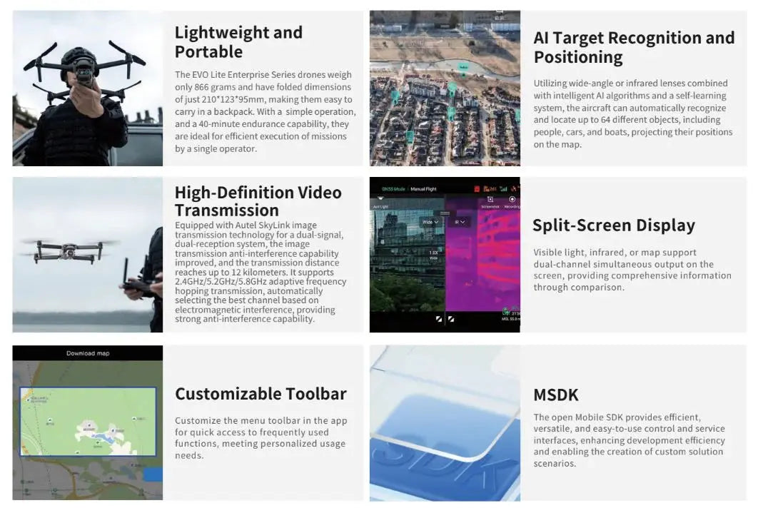 • Autel Enterprise App — professional flight mission software designed for industry applications with optimized interaction design, editable toolbars, and intelligent functions to maximize enterprise value.