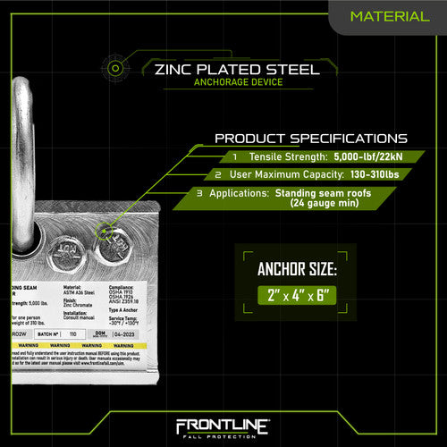 Whether you're a contractor, safety officer, or safety-conscious professional tackling tall roofs, this anchor delivers dependable performance in a compact package. Build a safer work zone on standing seam roofs with Frontline RO2W 2-Way Standing Seam Roof Anchor.