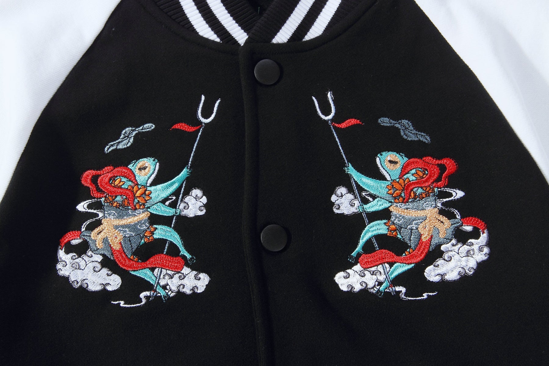 • Embroidery frog warrior designs on the front and back inspired by East Asian culture.