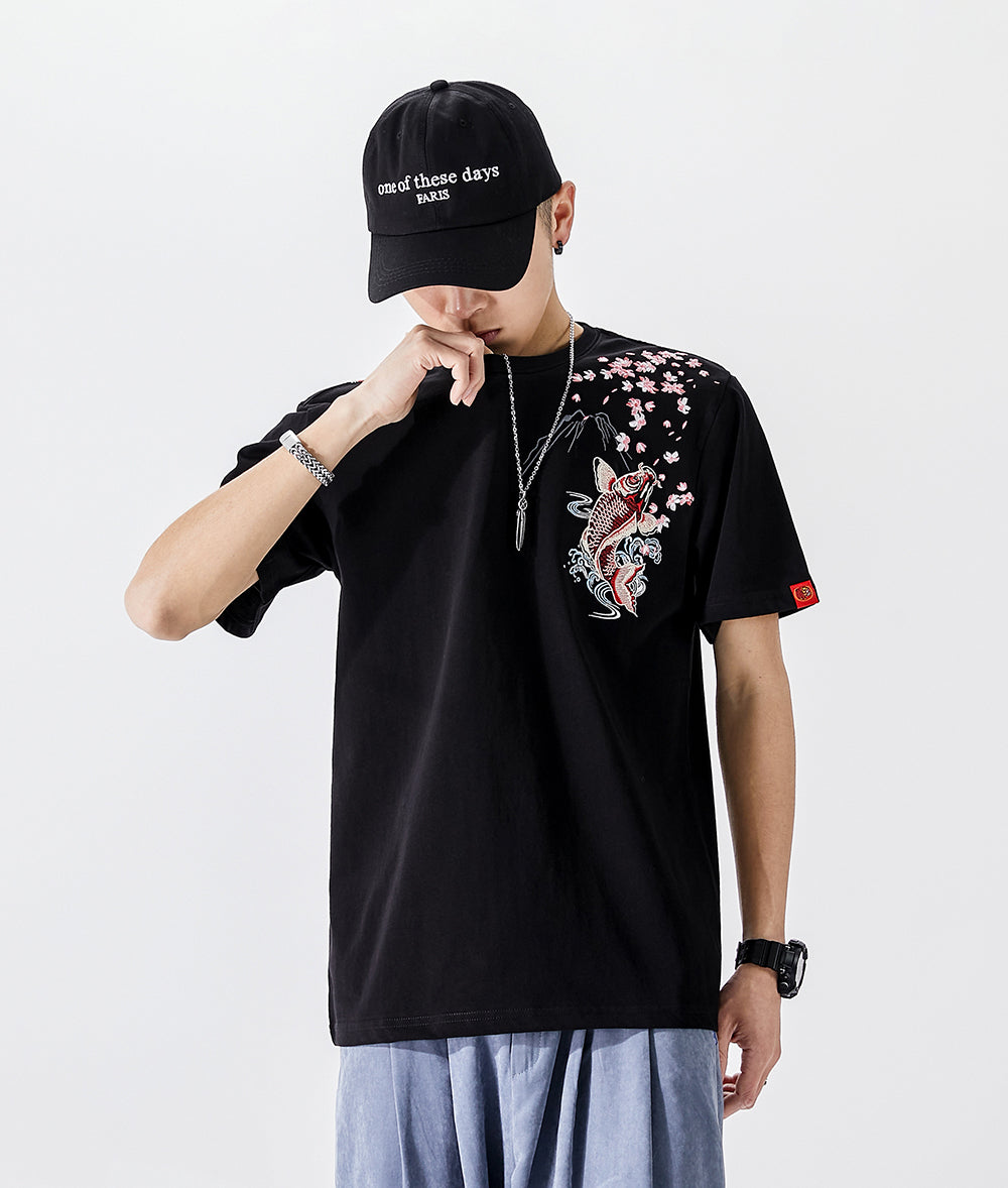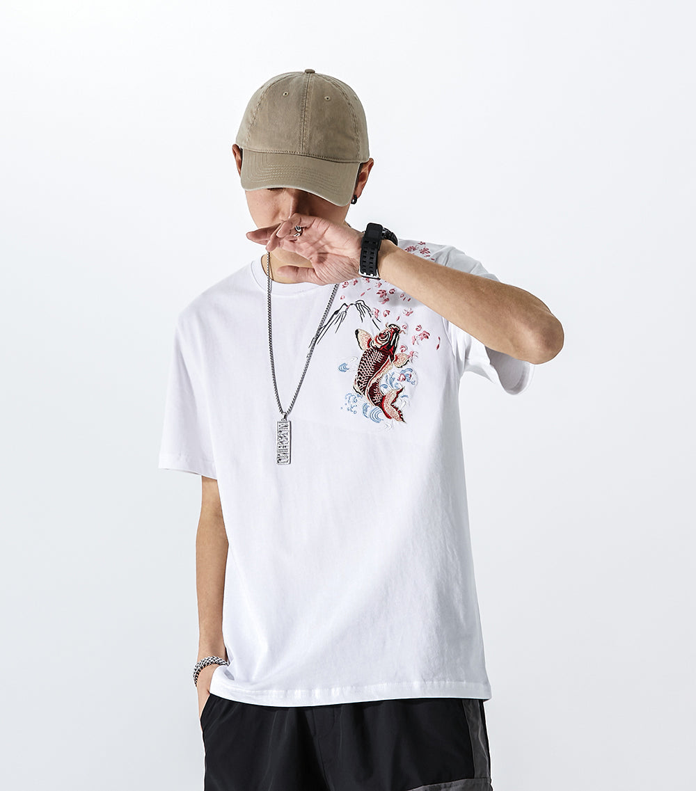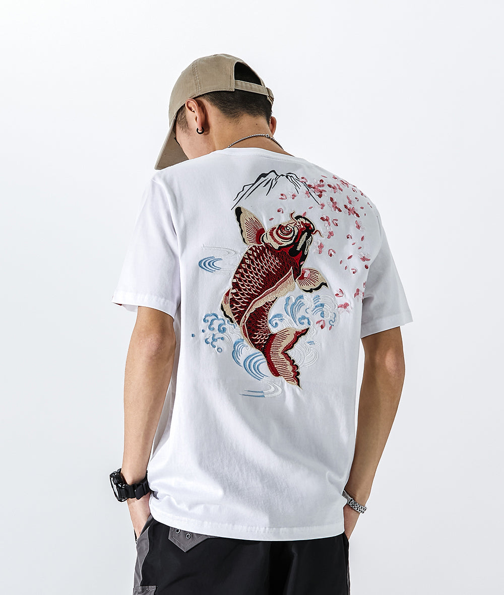 KH628 Red Koi Embroidery Tee—a premium tee built for fans of bold embroidery and lasting comfort. In a striking red, it features 100% embroidery design on the front and back and a soft, durable feel that lasts.