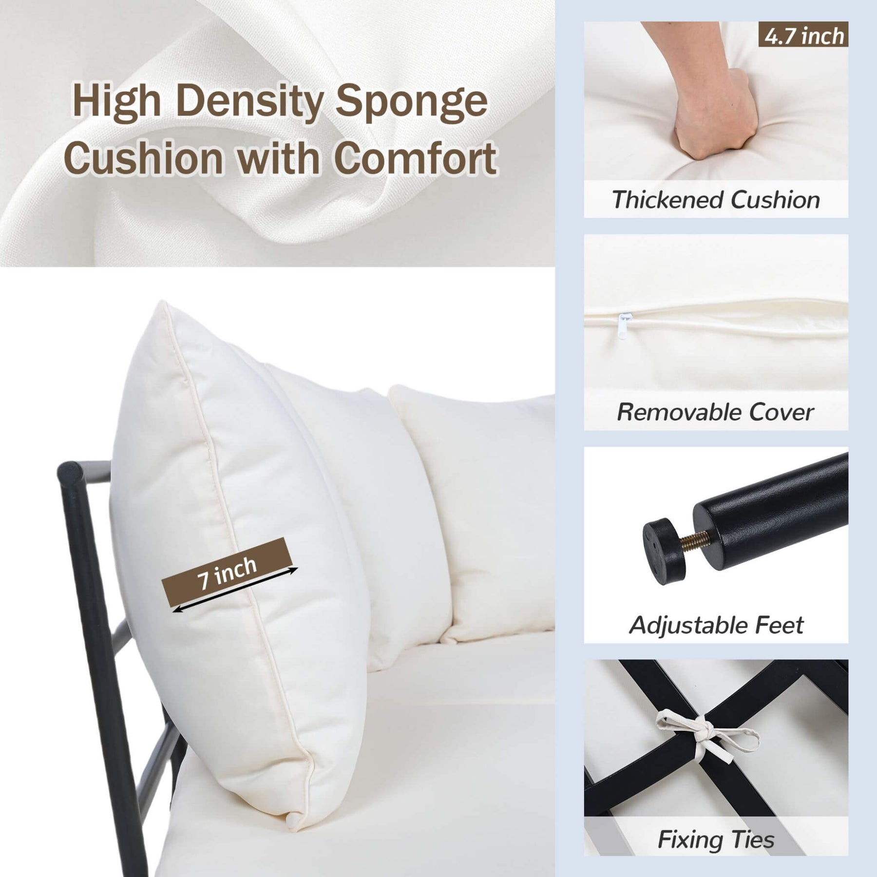 • 4.72-inch thick cushions for plush comfort, with waterproof and stain-resistant properties and a secure fixing strap to stay in place.