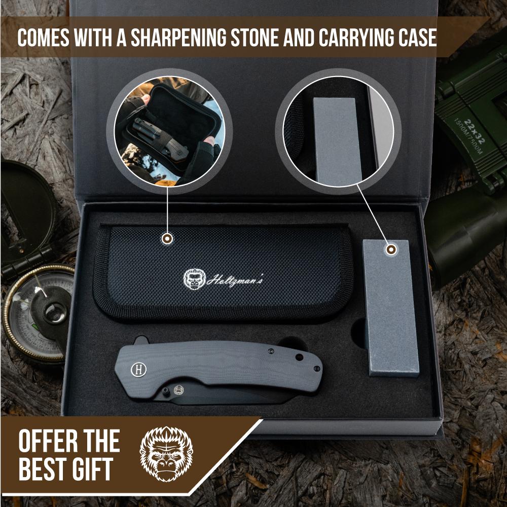 From the sturdy drop-point blade to the perfectly dialed-in thumb studs, this knife is designed to be portable, carried, and used. The complete pocket knife kit includes a sharpening stone to maintain a razor-sharp edge and a carrying case for safe, ready-to-go EDC use.