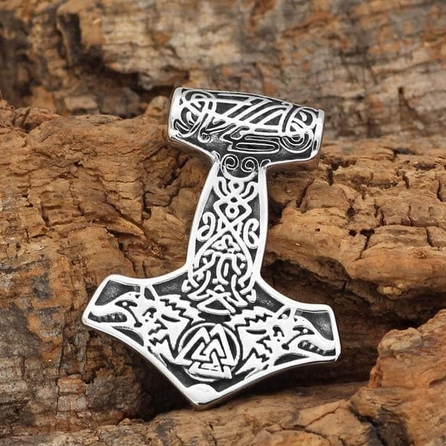 • Symbolic design: The pendant features the two wolves of Odin—Geri & Freki—with the Valknut emblem on the pommel of a Mjolnir pendant.