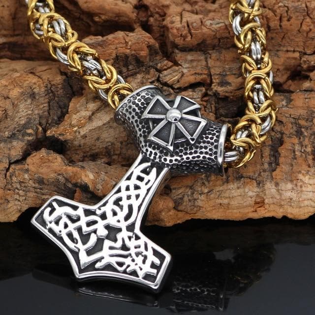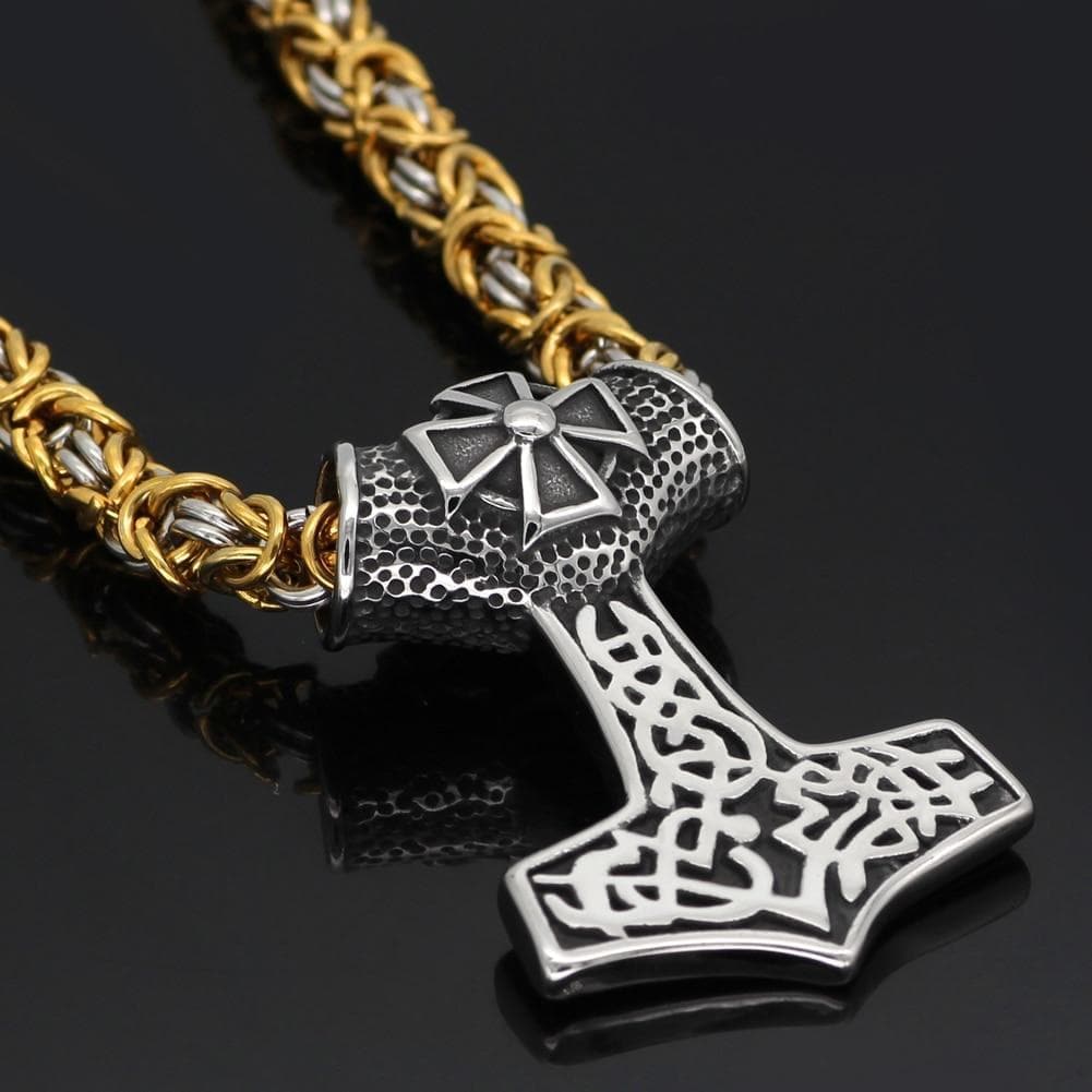 Timeless symbolism meets modern durability — Thor's Hammer represents protection and strength, while the Celtic Cross nods to ancient sun worship and Odin's lore. The two symbols are crafted into a single, striking pendant that pairs with a two-tone chain for versatile style.