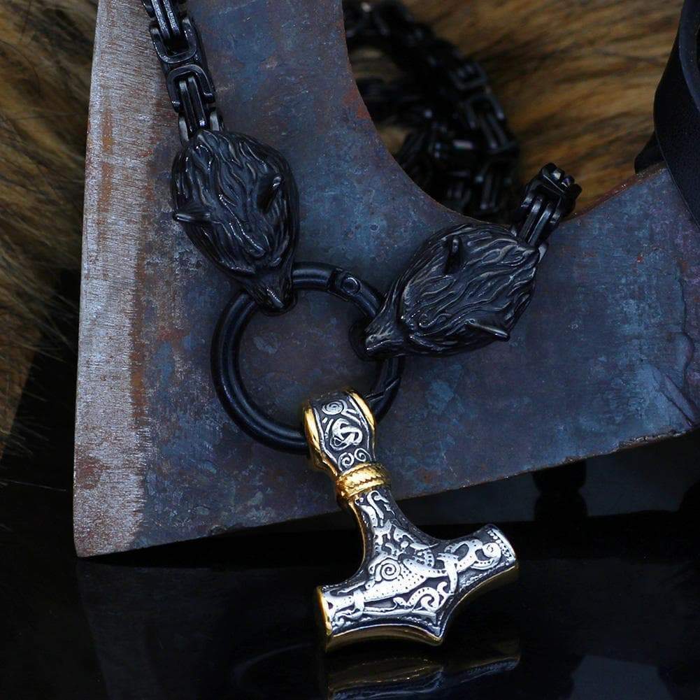 • Design details: A King Chain ending in the heads of Geri and Freki, the wolves of Odin, that bite onto a ring with a large Mjölnir pendant.