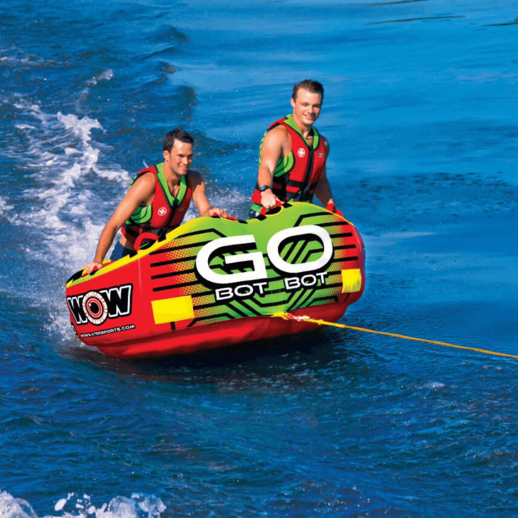 Get going on the water with the Go Bot Towable from WOW. Designed with family fun in mind, the Go Bot makes a great towable for the youngest to the oldest in the family. Ride in the seated position from the front tow point or connect the rope to the back tow point and ride chariot style. The deep cockpit seating with a high backrest makes the riders feel more secure while the drop speed bottom glides smoothly over the water creating less drag on the boat and therefore better gas mileage. Our new slotted EZ entry system makes it easier than ever to get back on the towable if you do happen to get thrown out of it. The Go Bot will be loved by everyone in the family; from those that like a nice and easy ride to those that want something more extreme.