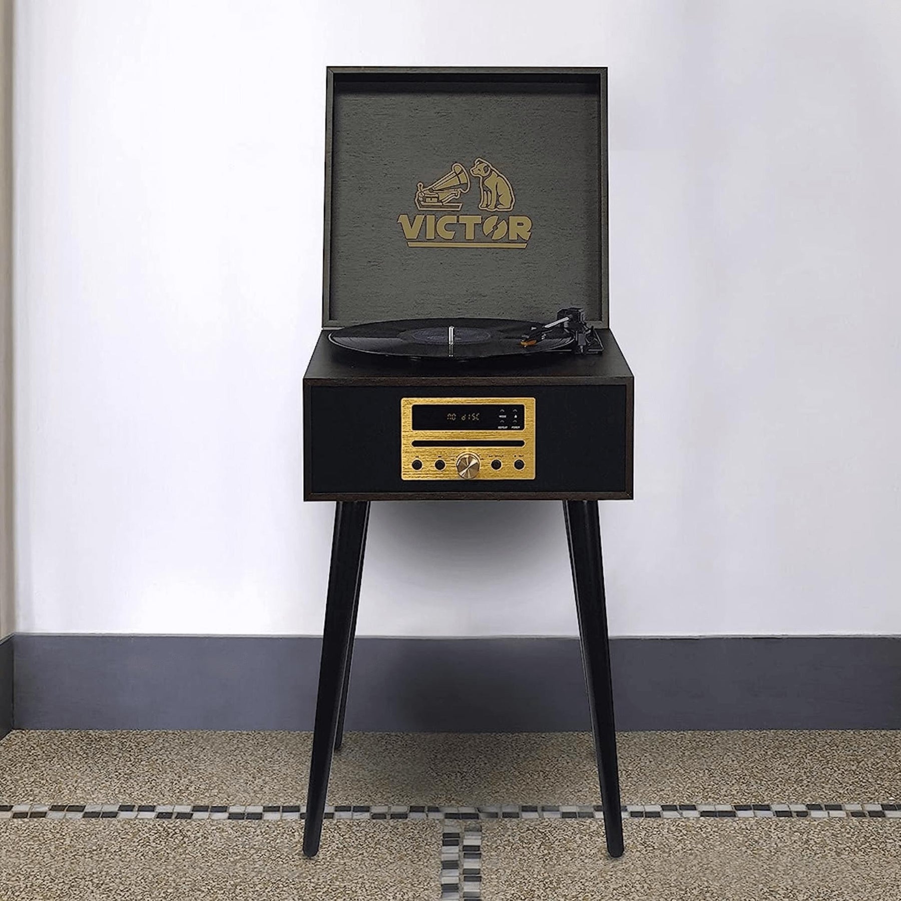 Introducing the Victor Newbury 8-in-1 Music Center with Chair-Height Legs—a retro-inspired hub that brings vinyl, CDs, FM radio, and streaming together in one elegant wood cabinet. It’s for music lovers who want big vibes and real convenience, without juggling multiple devices.