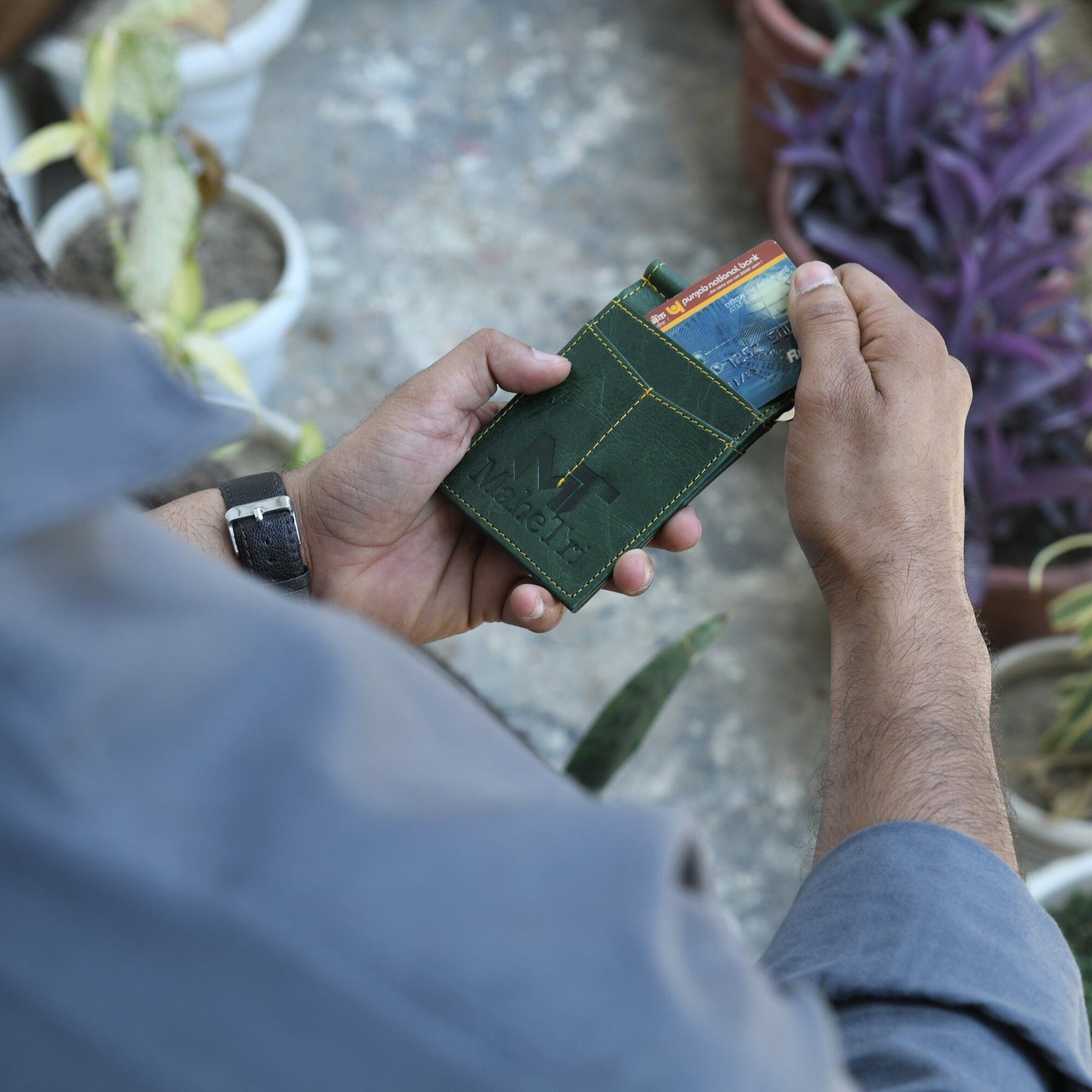 The Finley Money Clipper - Green is a beautifully slim profile money clip wallet crafted for everyday carry, combining refined style with practical organization. Handcrafted from buffalo leather by highly skilled artisans, it keeps cash, cards, and ID neatly in place without the bulk.