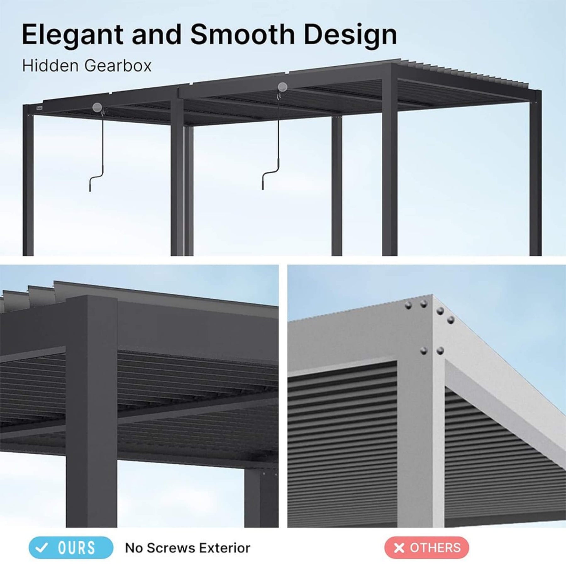 • Materials — Crafted from high-quality premium aluminum, this pergola stands the test of time. The powder-coated frame and advanced louvers are not only aesthetically pleasing but are built to withstand winds of up to 63mph.
