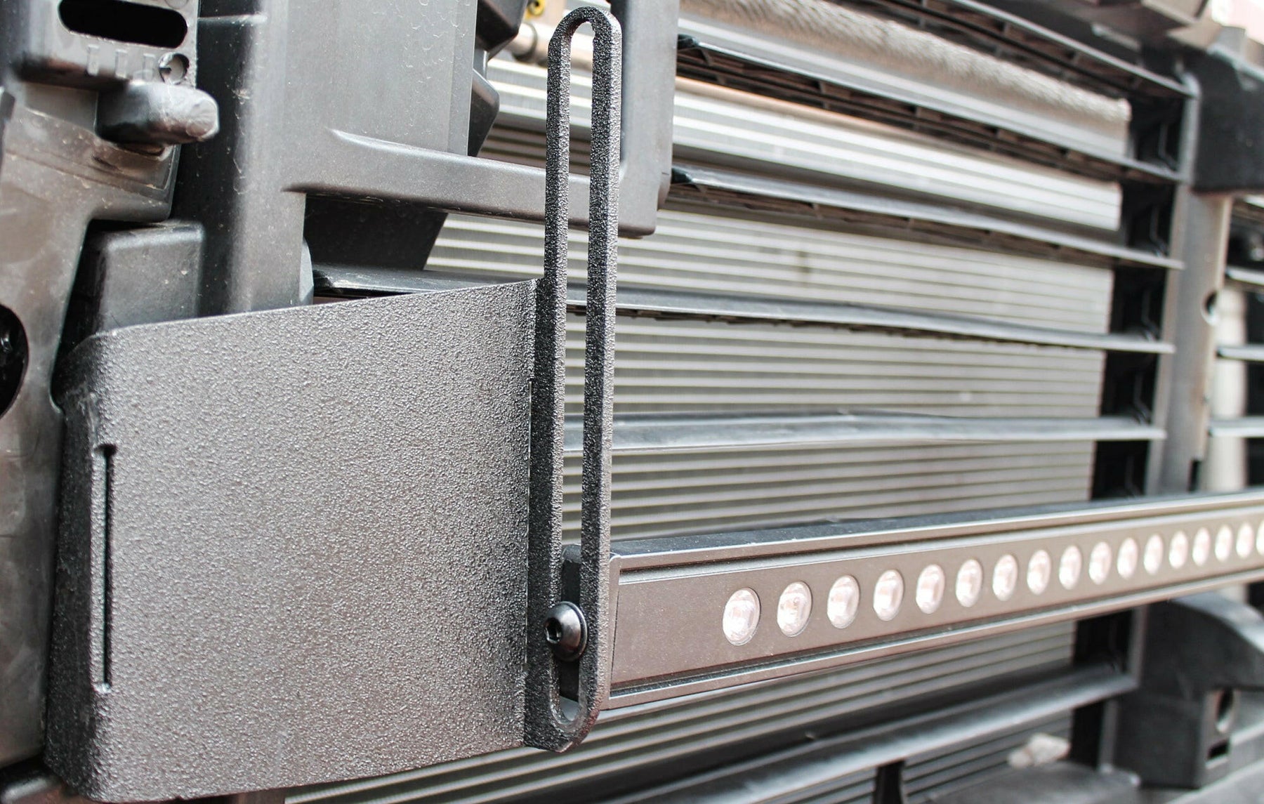 • The mounting bracket is on a rail system (see photo). This allows you to move the light bar up or down of about 6in. You choose where you want the light bar to shine through the grille.