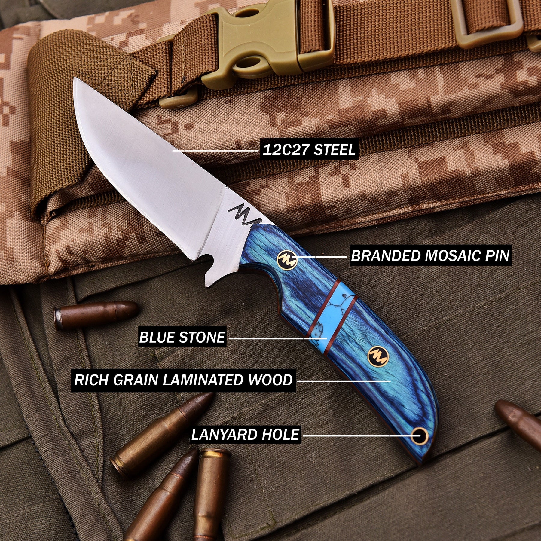 The handle is crafted from Rich Grain Laminated Wood, elegantly accented with a turquoise stone inlay and mosaic pins for a bold, collectible look. It balances beauty with a secure, ergonomic grip. The blade is forged from premium 12c27 steel to hold an edge and resist corrosion, and the full tang construction ensures strength you can trust in the field. Comes with a premium hand-stitched vertical leather sheath for safe carry and quick access.