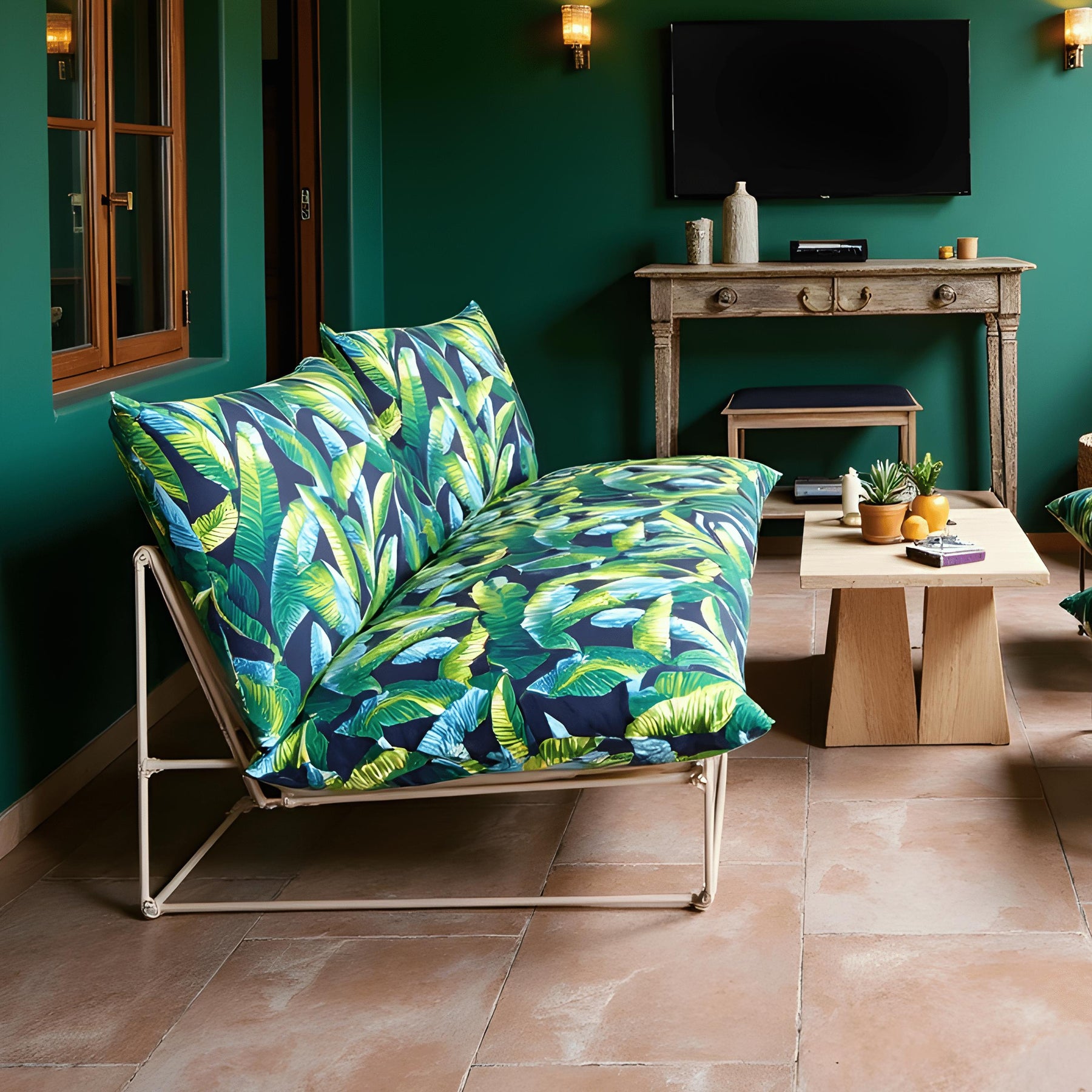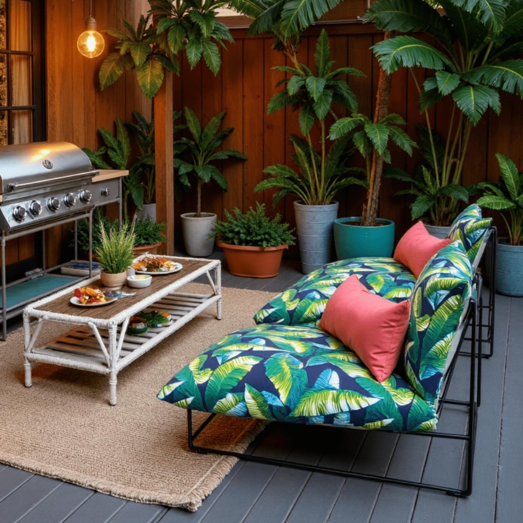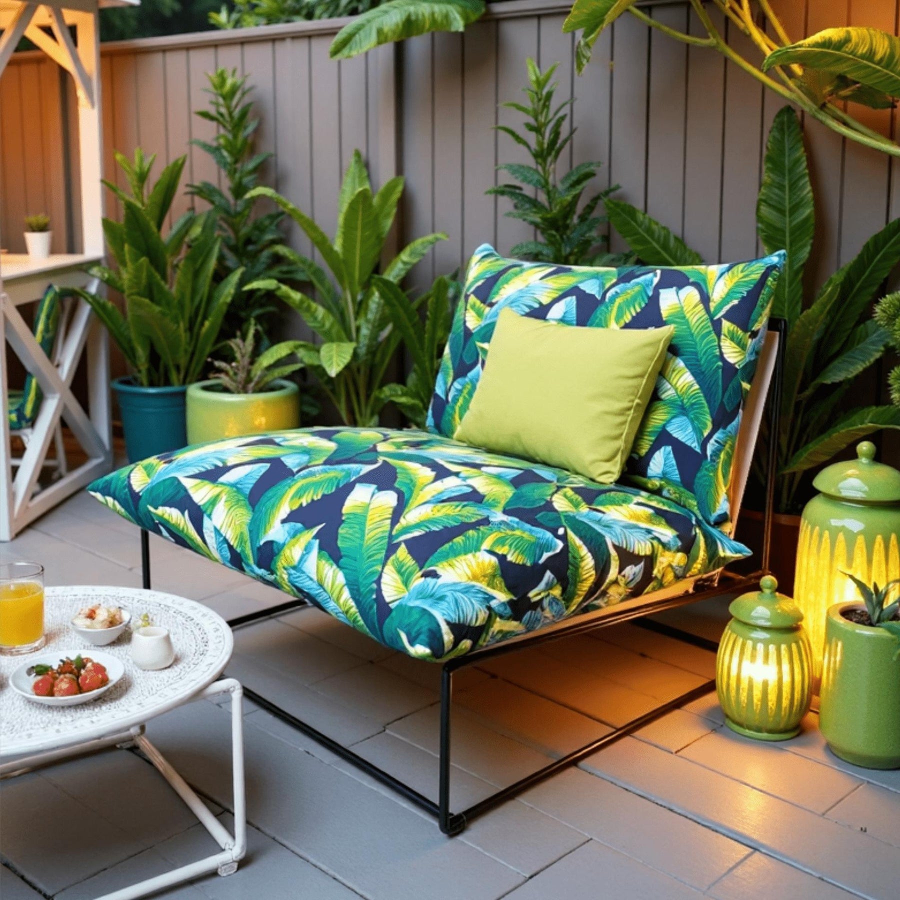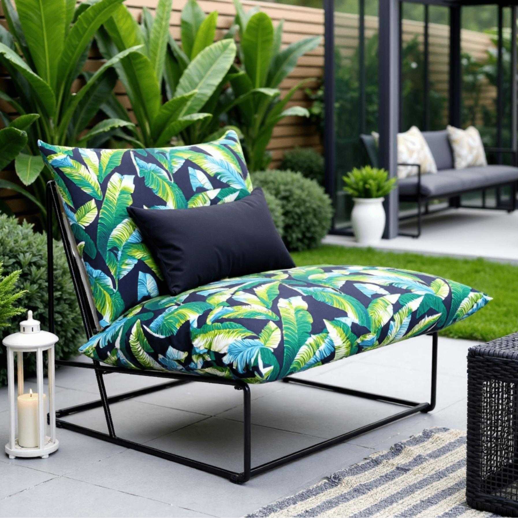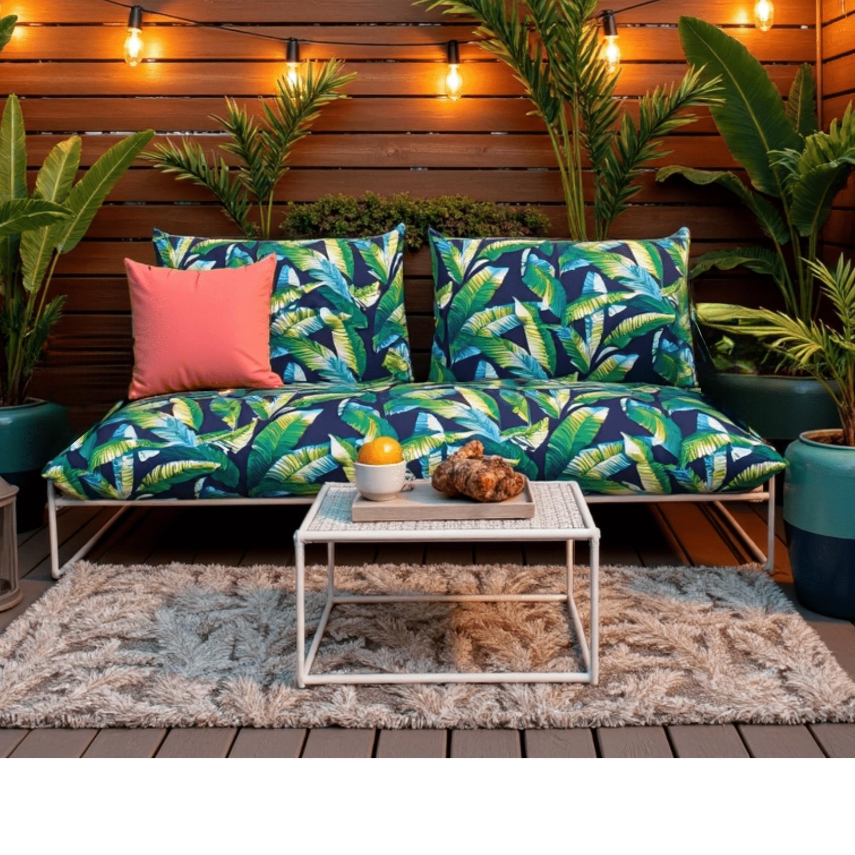 • Tropical Blue Palms Design: Banana and palm leaves in chic navy and green create a dynamic, high-impact look for your patio or garden.