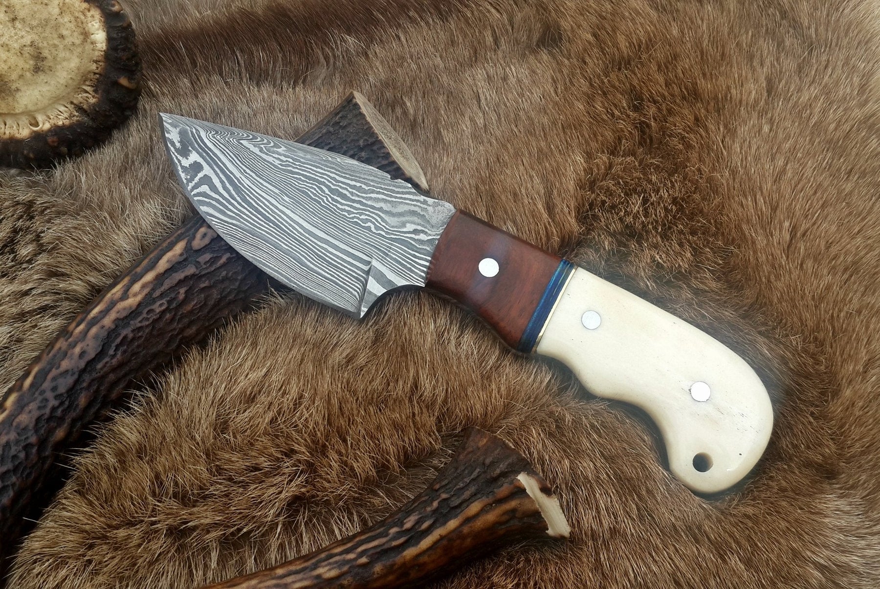 Damascus Steel Drop Point Skinning Knife with Bone and Rosewood Handle – 7 Inch Overall Length