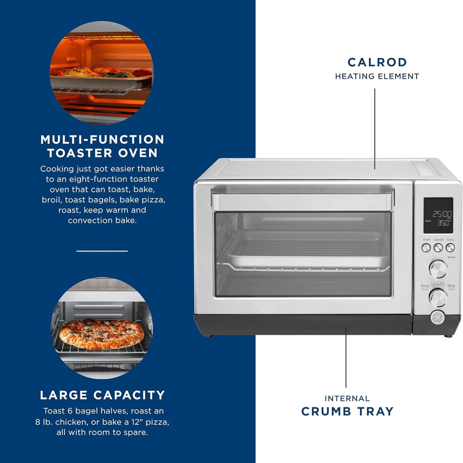 • Extra-Large Capacity:.88 cu.ft. of interior space that can easily fit a 12" pizza, 6 slices of toast, a 3-quart casserole, or a 9 x 11 in. baking pan.